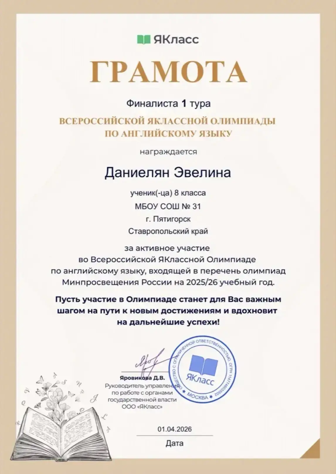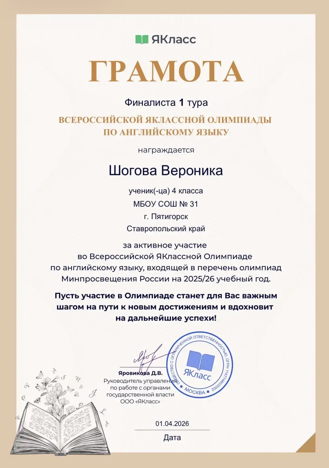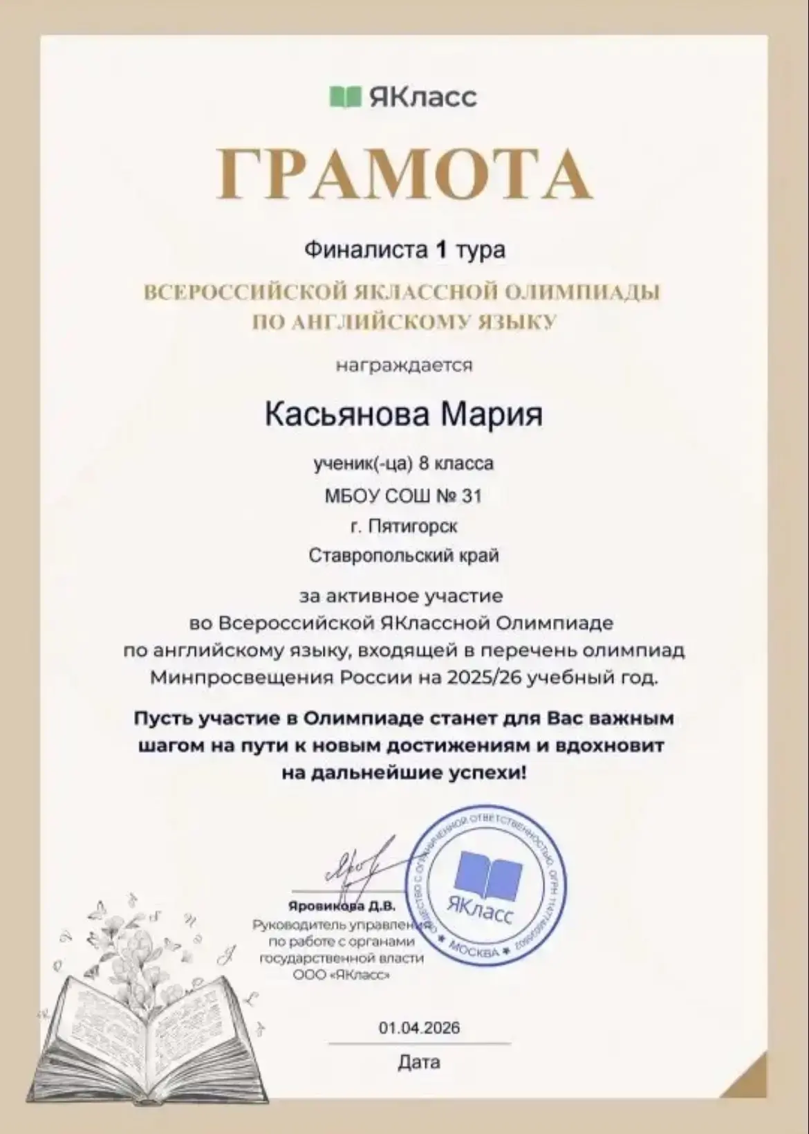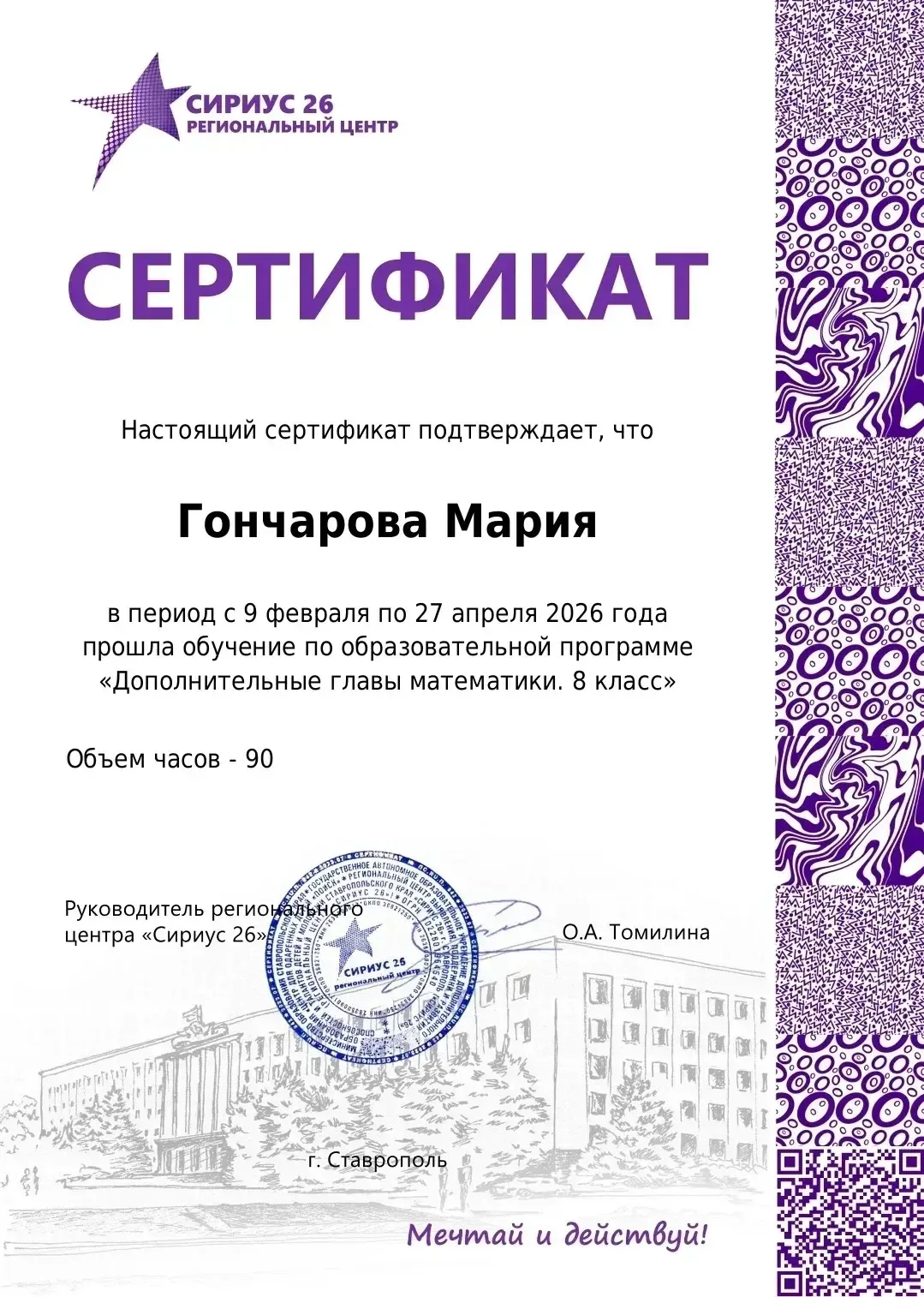 Мария Гончарова завершила обучение по курсу математики в региональном центре Сириус-26 в г.Ставрополь.