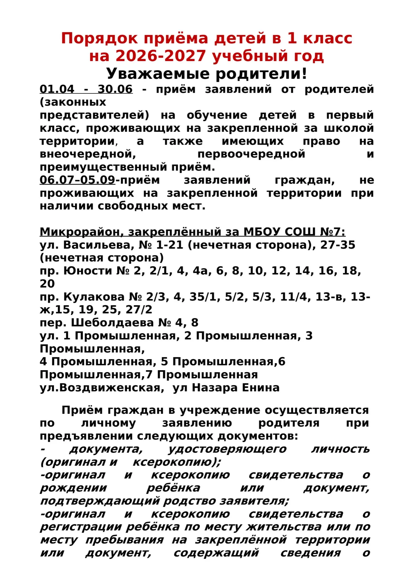 Порядок приема детей в 1 класс на 2026-2027 учебный год ‼️