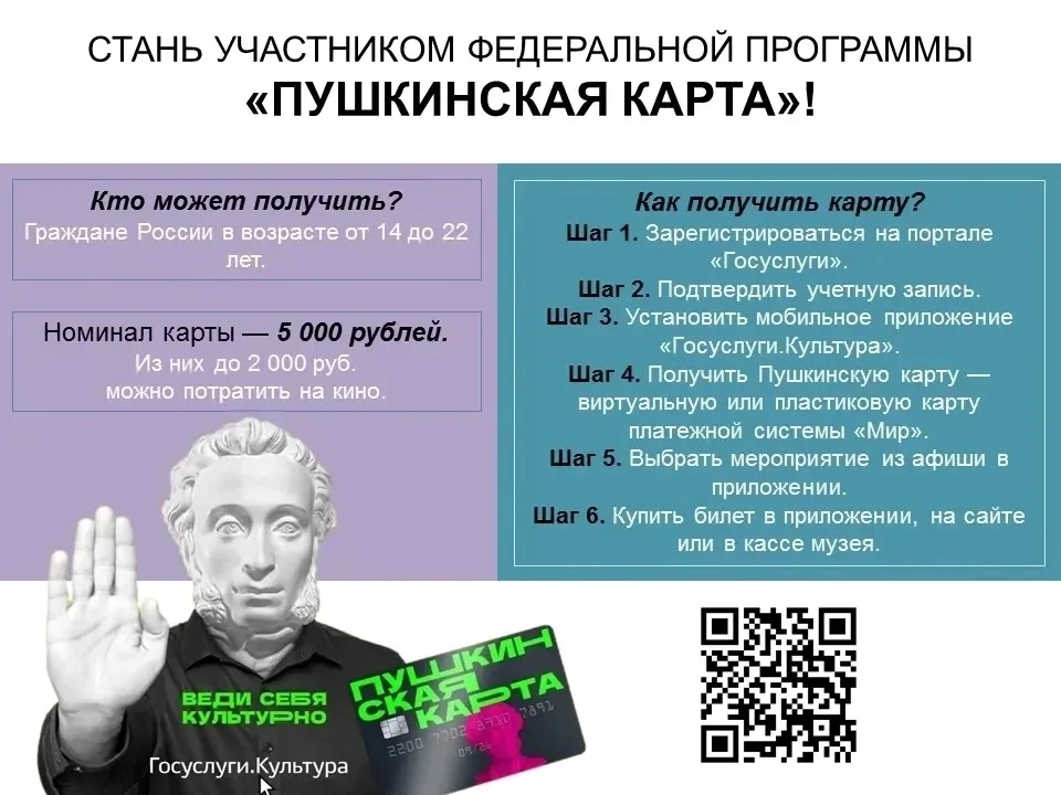 📎Оформить «Пушкинскую карту» могут граждане РФ от 14 до 22 лет, имеющие подтвержденную учетную запись на Госуслугах. Основной способ — скачать приложение «Госуслуги Культура», авторизоваться и выпустить виртуальную карту «Мир». Пластиковую карту можно получить в отделениях ВТБ (с 2026 года).