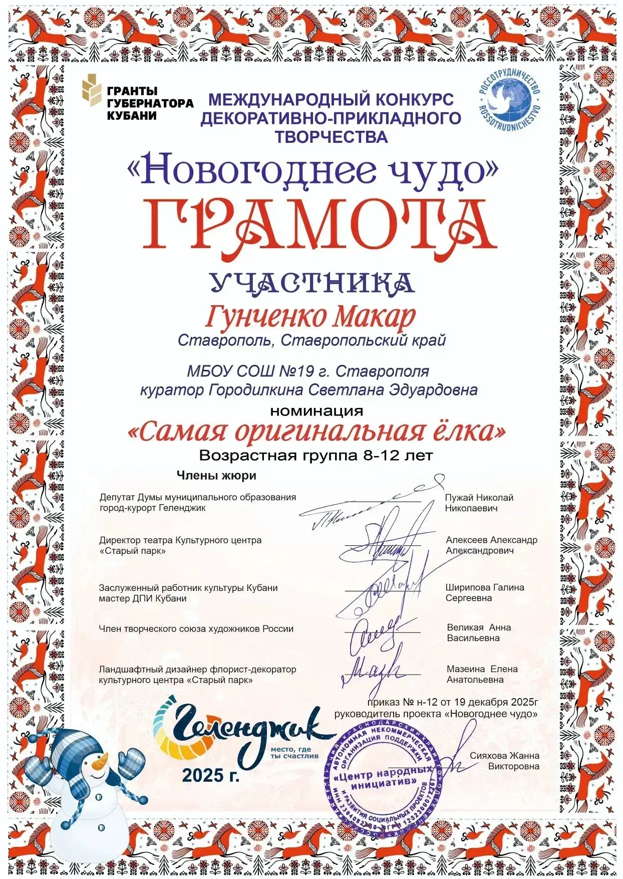 Гунченко Макар, ученик 4 «Б» класса, принял участие в международном конкурсе декоративно - прикладного творчества. Макар получил грамоту участника в номинации "Самая оригинальная ёлка".