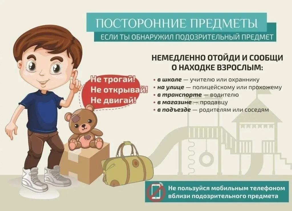 Нельзя поднимать и трогать неизвестные предметы — это может быть опасно для жизни. Под видом безобидного предмета может быть заложено взрывное устройство, предмет может содержать ядовитые, радиоактивные или химические вещества.