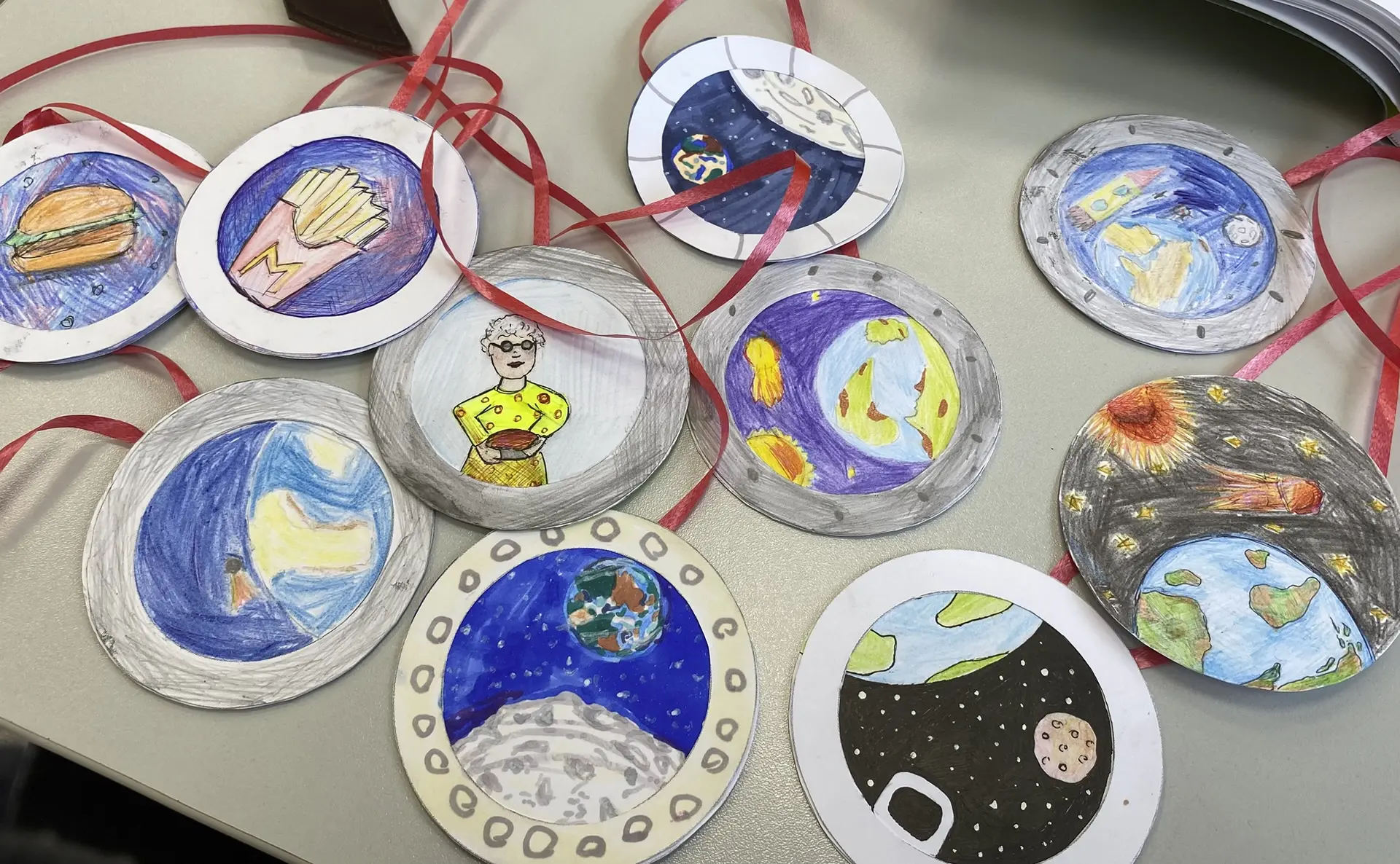 💫Ребята делали иллюминаторы - не простые, а с разным смыслом. На одних рисунках они изобразили то, что видят космонавты: звёзды, Млечный Путь, Землю из иллюминатора. А на других то, о чём космонавты скучают на орбите: зелёную траву, мамины пирожки и самые обычные земные радости.