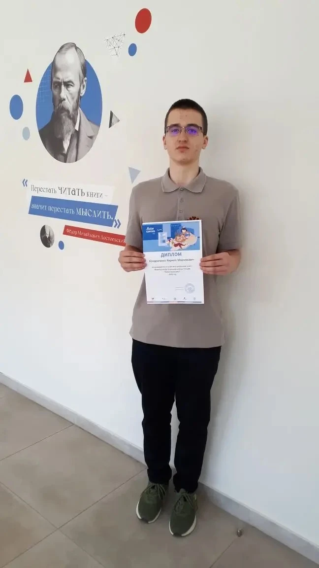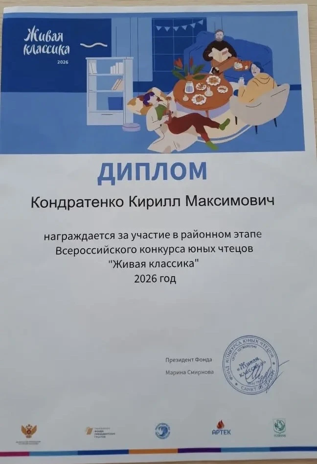 Ученик 8 «Б» класса Кирилл Кондратенко достойно представил нашу школу на районном этапе Всероссийского конкурса юных чтецов «Живая классика». Для выступления он выбрал пронзительный отрывок из повести Бориса Полевого «Повесть о настоящем человеке» - это произведение о невероятной силе духа и патриотизме советского летчика Алексея Мересьева.