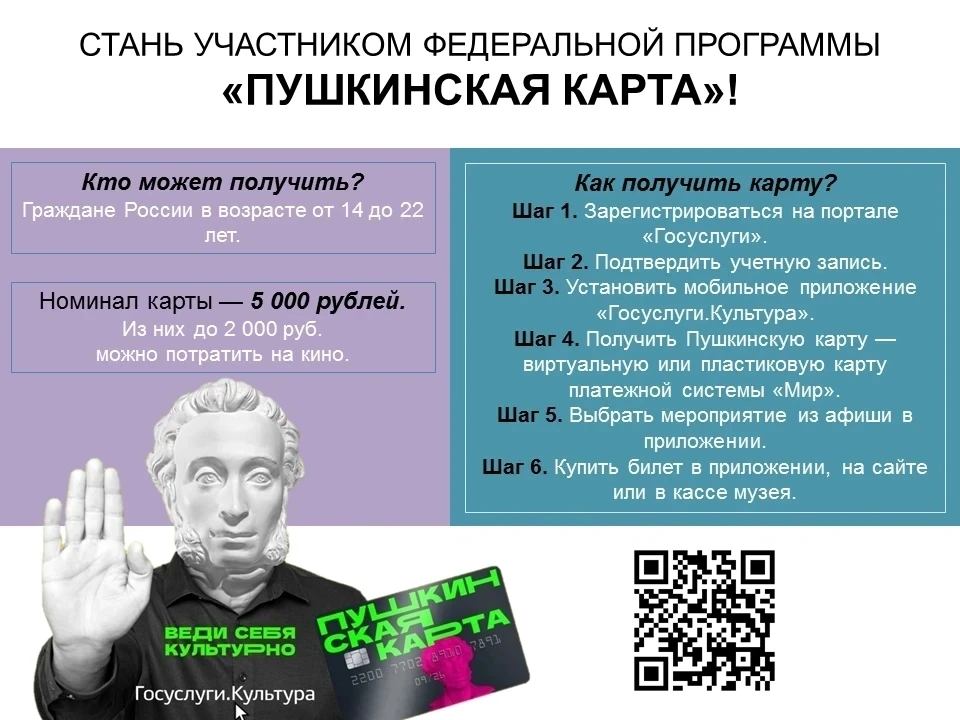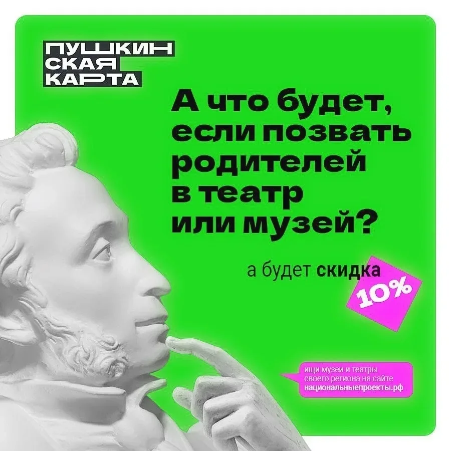 Владельцы Пушкинской карты смогут не только бесплатно посещать музей и филиалы, но и получить скидку 10% на покупку билетов для родителей. С 2025 года программа «Пушкинская карта» стала частью национального проекта «Семья».
