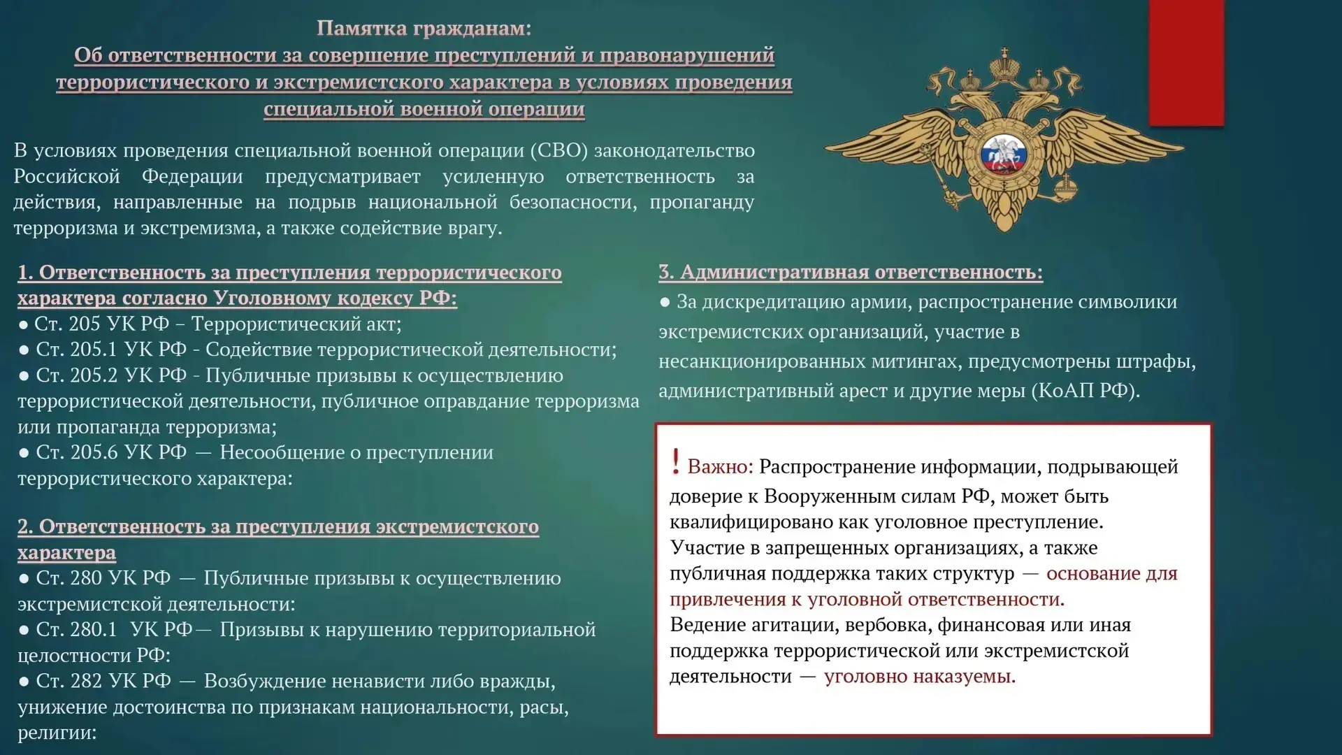 ❗️Чтобы противостоять разрушительной идеологии, важно знать не только свои права, но и обязанности - это основа безопасности всего общества. ❗️Также напоминаем: любая противоправная деятельность подобного рода влечёт за собой ответственность, а наказание неотвратимо.