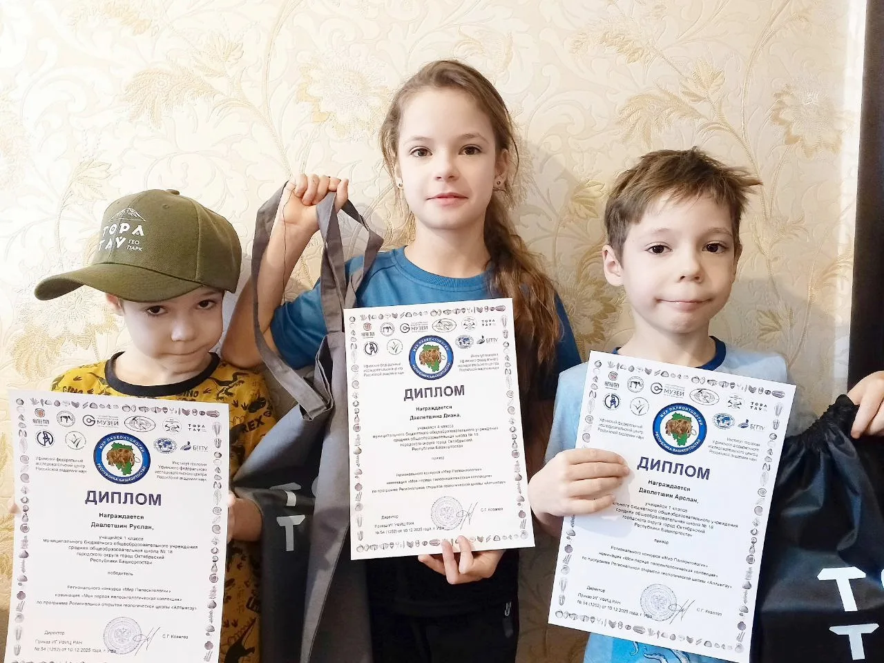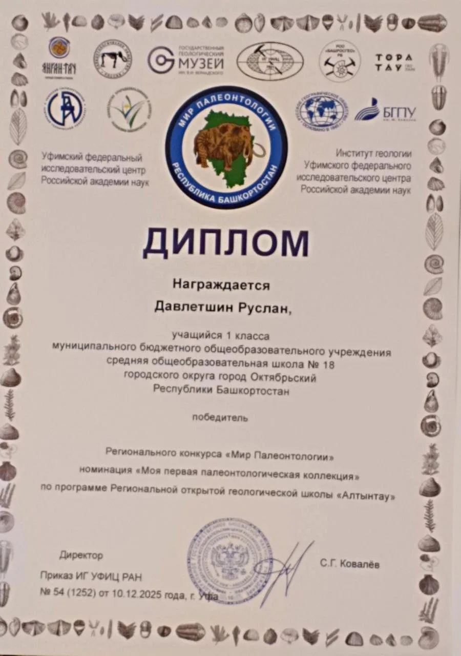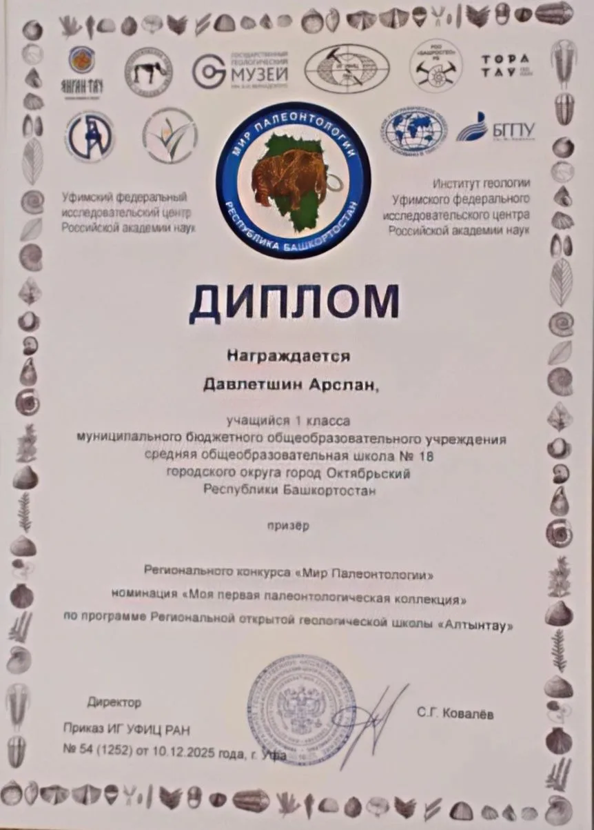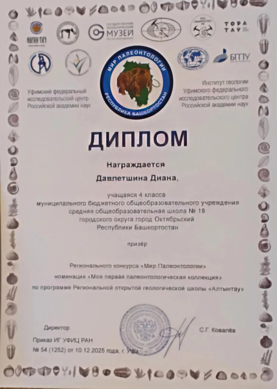 Поздравляем ученицу нашей школы Давлетшину Диану, учащуюся 4 Б класса, и её братьев Давлетшиных Арслана и Руслана, учащихся 1 А класса, ставших призёрами и победителями регионального конкурса «Мир Палеонтологии» в номинации «Моя первая палеонтологическая коллекция». Они приняли участие в конкурсе по программе региональной открытой геологической школы «Алтынтау»!