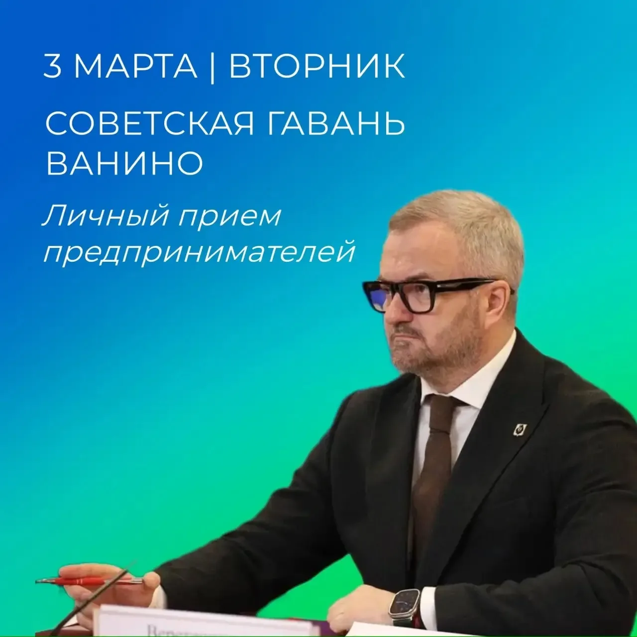 📆3 марта 2026 года в 11.00 часов Уполномоченный по защите прав предпринимателей в Хабаровском крае Андрей Веретенников проведет личный прием предпринимателей в г. Советская Гавань по адресу: ул. Ленина, д. 3, Актовый зал Администрации Советско-Гаванского муниципального района.