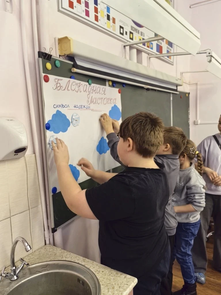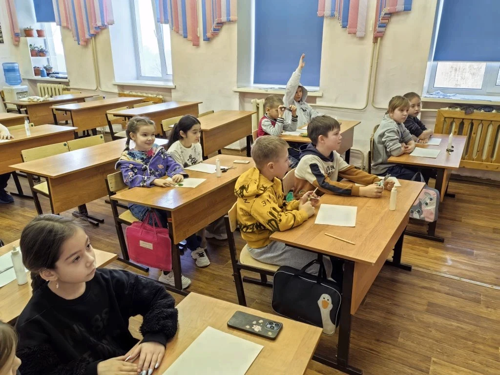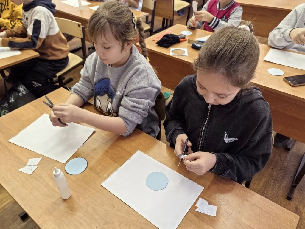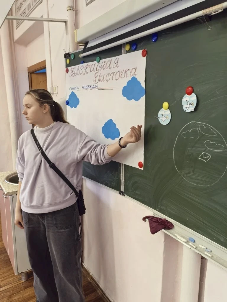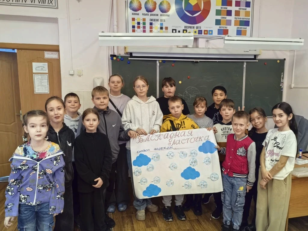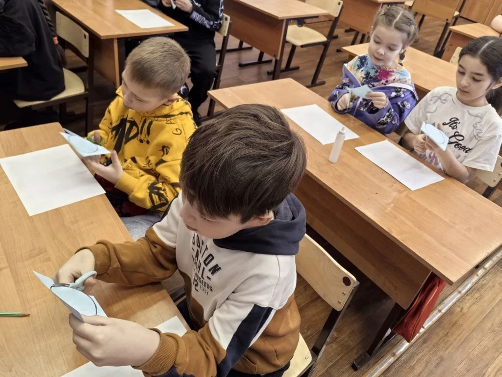 Представители Движения Первых Вика Пацук и Милана Гришина провели для ребят начальной школы трогательный мастер‑класс по изготовлению «блокадных ласточек». На занятии они рассказали, что во время блокады Ленинграда жители носили на груди маленький жестяной значок в виде ласточки с письмом в клюве — ответ на фразу врага о том, что «даже птица не пролетит через блокаду». Этот знак назывался «Жду письма» и означал надежду на весточку от близких и веру в то, что всё обязательно будет хорошо.