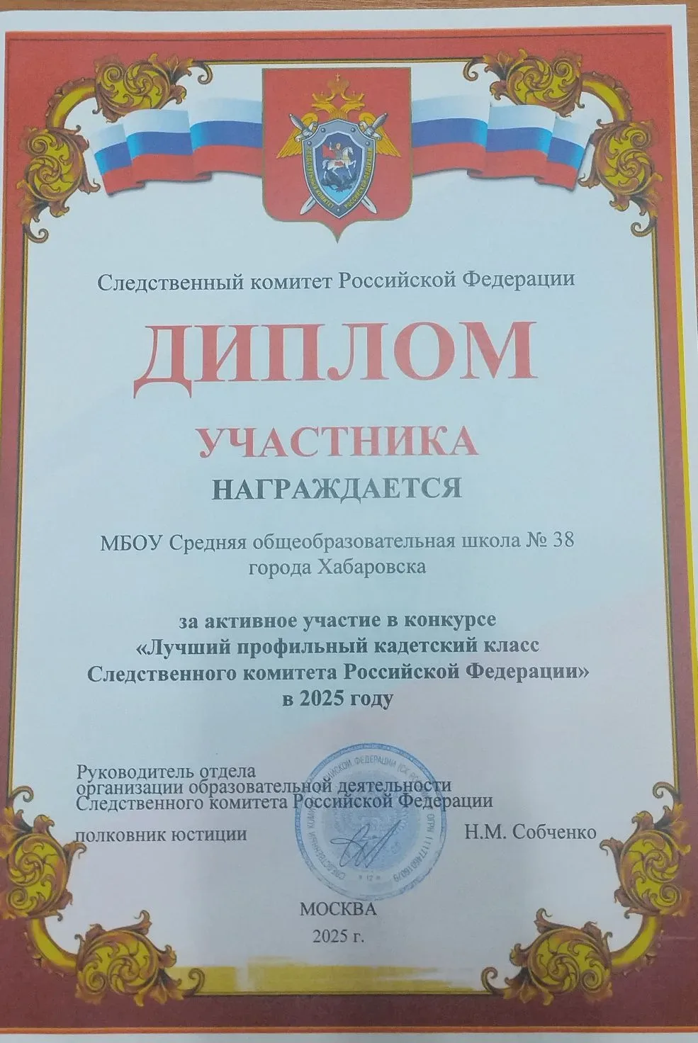В 2025 году кадетский класс МБОУ СОШ № 38 принял участие во всероссийском конкурсе «Лучший профильный кадетский класс Следственного комитета Российской Федерации» и занял 9 место из 29 кадетских классов со всей страны.