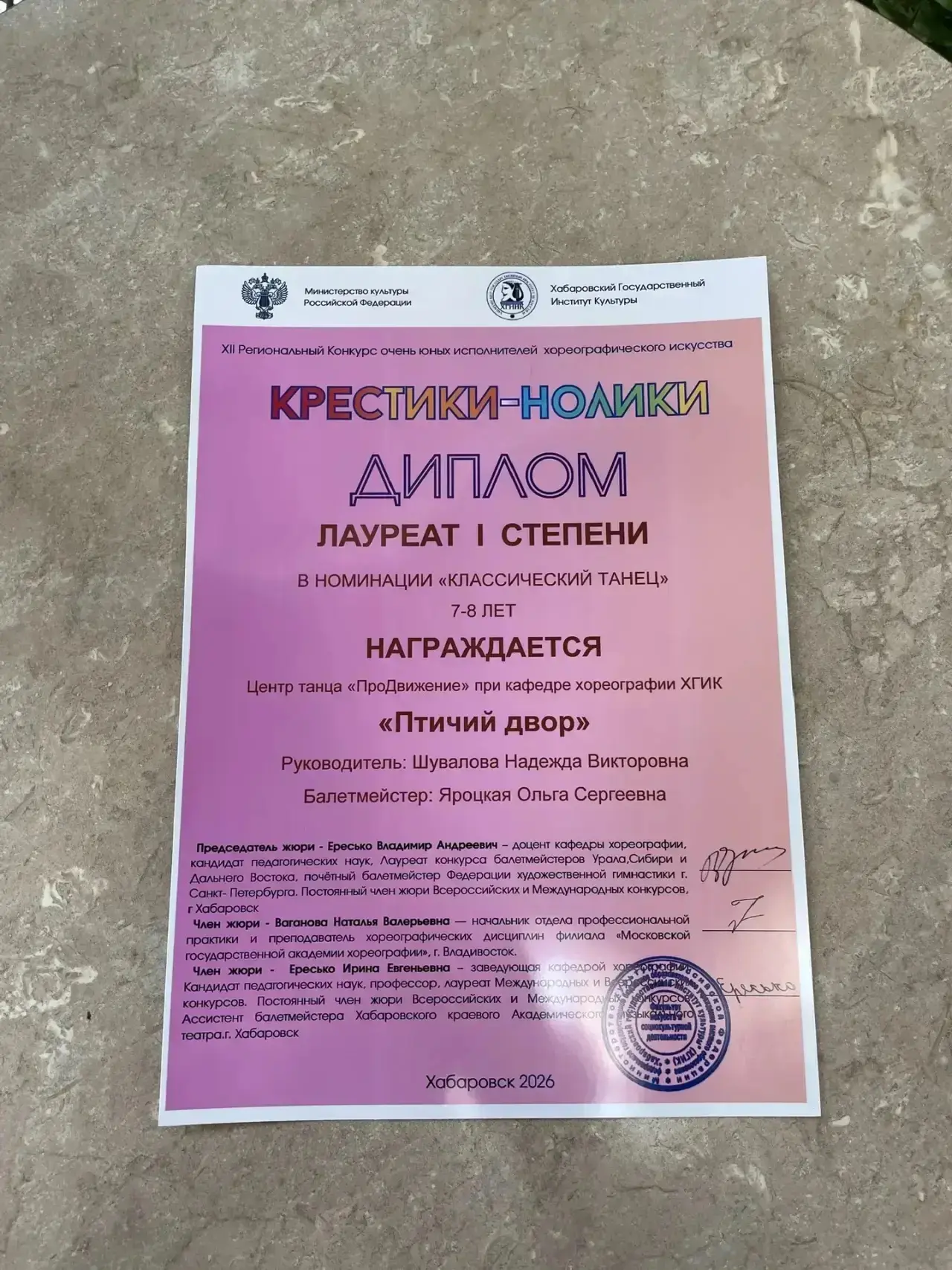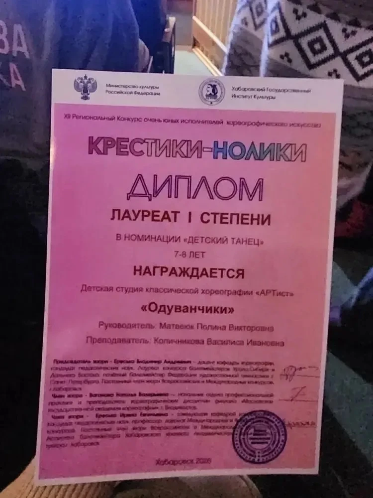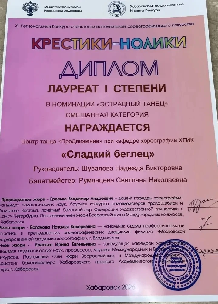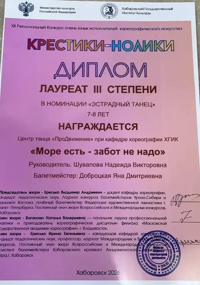 22 февраля ученица нашей школы Лада Рыжкова, ученица 1 В класса, в составе 2 хореографического класса центра танца «ПроДвижение» при кафедре хореографии ХГИК участвовала 22.02.2026 в 12 Региональном конкурсе очень юных исполнителей хореографического искусства «Крестики-нолики».