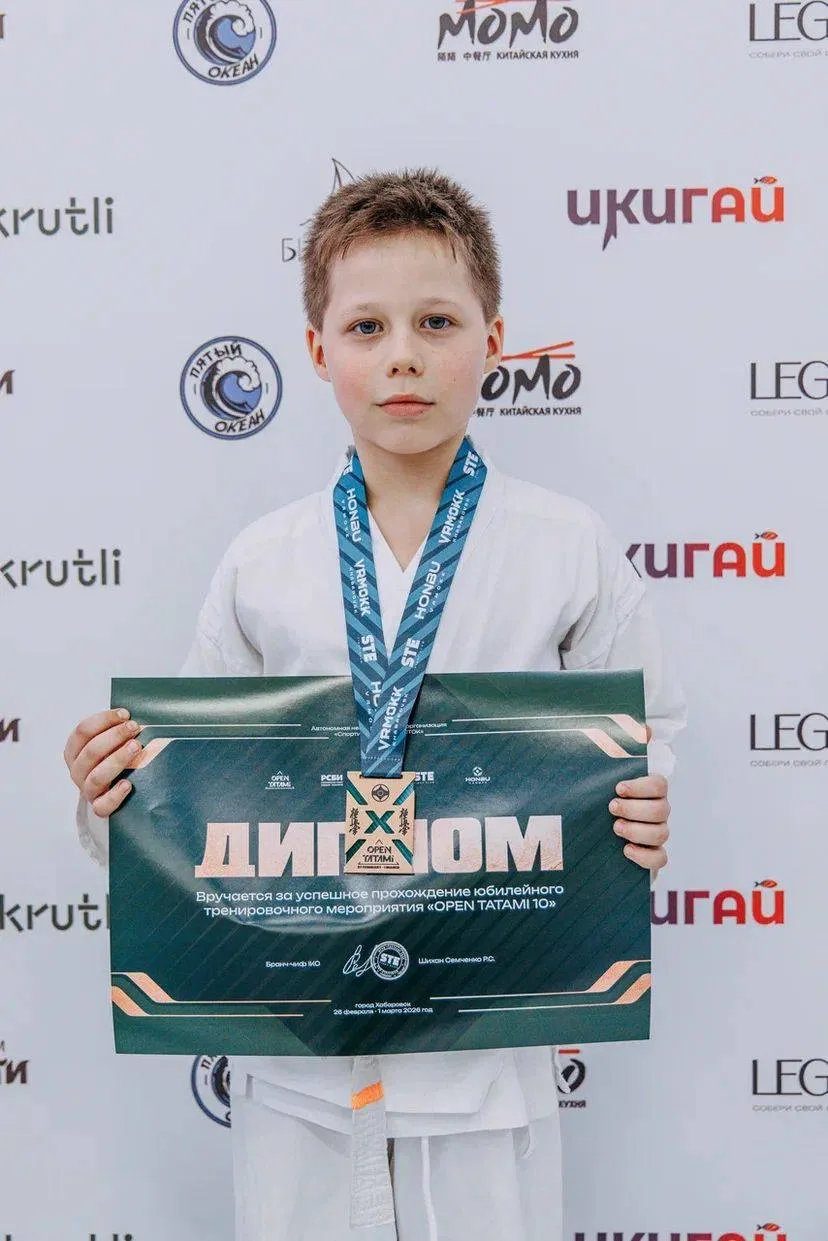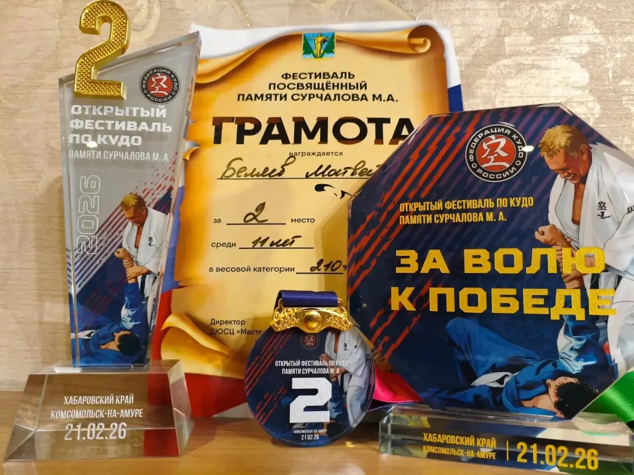Ученик 5к класса, Беляев Матвей, 21.02.2026 принимал участие в Открытом фестивале по Кудо, посвящённом памяти Сурчалова М. А., проходившим в г. Комсомольск-на-Амуре, где занял в своей возрастной и весовой категории почётное 2 место и отмечен специальным призом "За волю к победе".
