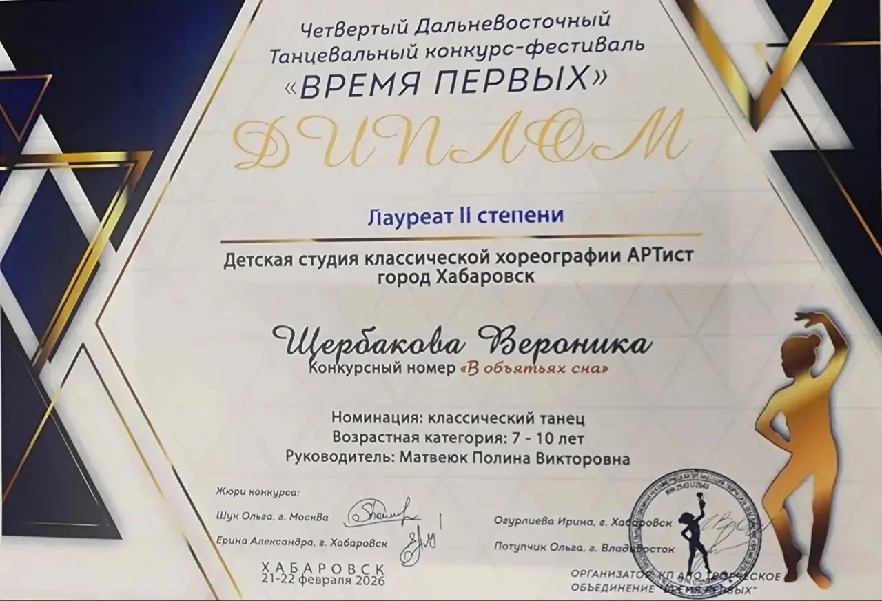 Четвертый дальневосточный танцевальный конкурс-фестиваль «Время первых» (жюри Ольга Шук, г.Москва). Танец «В объятиях сна», малая форма, солистка Вероника Щербакова 7 лет. Номинация «Классический танец» Лауреат II степени!