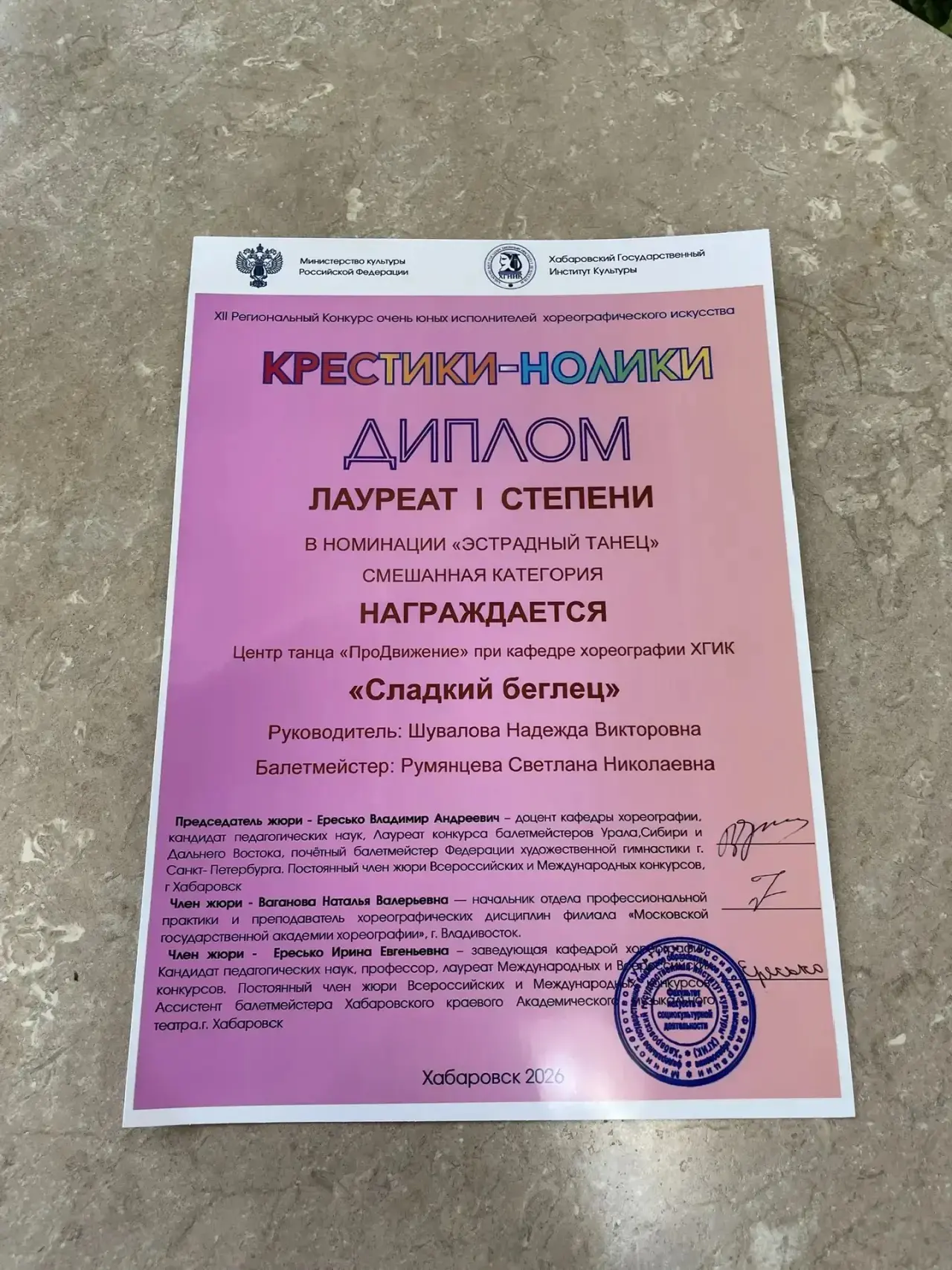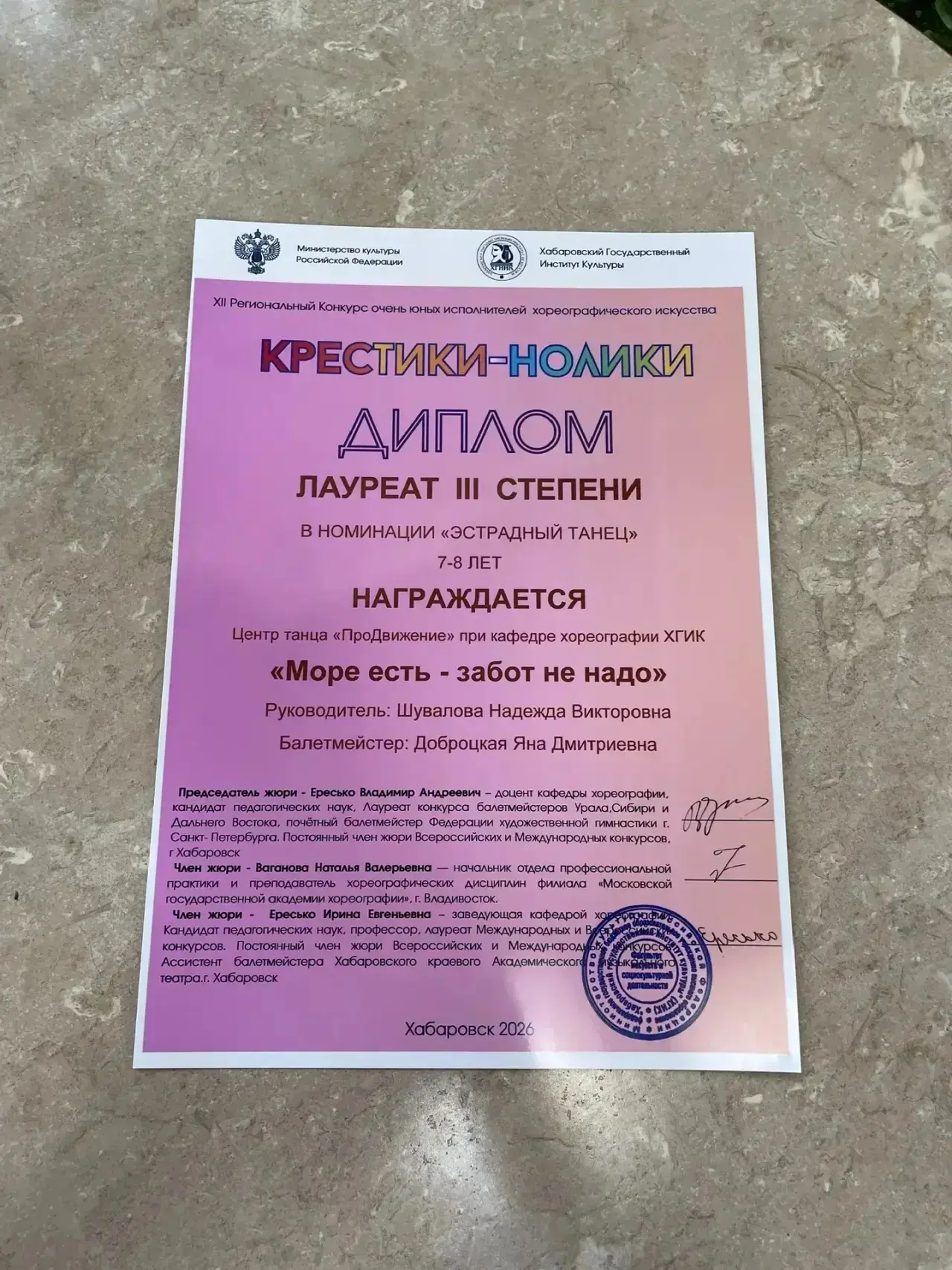 22 февраля наши ученицы 1-х и 2-х классов: Глушкова Диана, Ермолина Алина, Федореева Ксения, Хамраева Амира, Епифанцева Ксения, Старикова Катя приняли участие в XII Региональном конкурсе очень юных исполнителей хореографического искусства «Крестики-нолики - 2026». Девочки занимаются в Центре танца «ПроДвижение» при кафедре хореографии ХГИК и представили 2 номера - «Вот так сюрприз!» (Лауреат 1 степени) и «Галоша -не ноша» (Лауреат 2 степени).