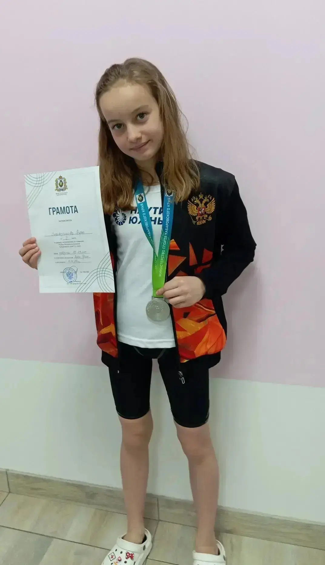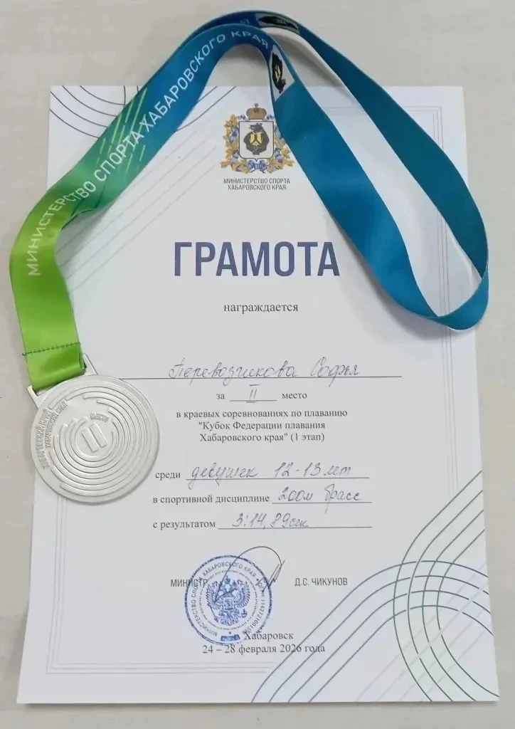 Перевозчикова Соня, ученица 5 И класса заняла второе место🥈 на Кубке Федерации плавания Хабаровского края, показав свое лучшее время 3:14:89, дистанция 200 брасс.