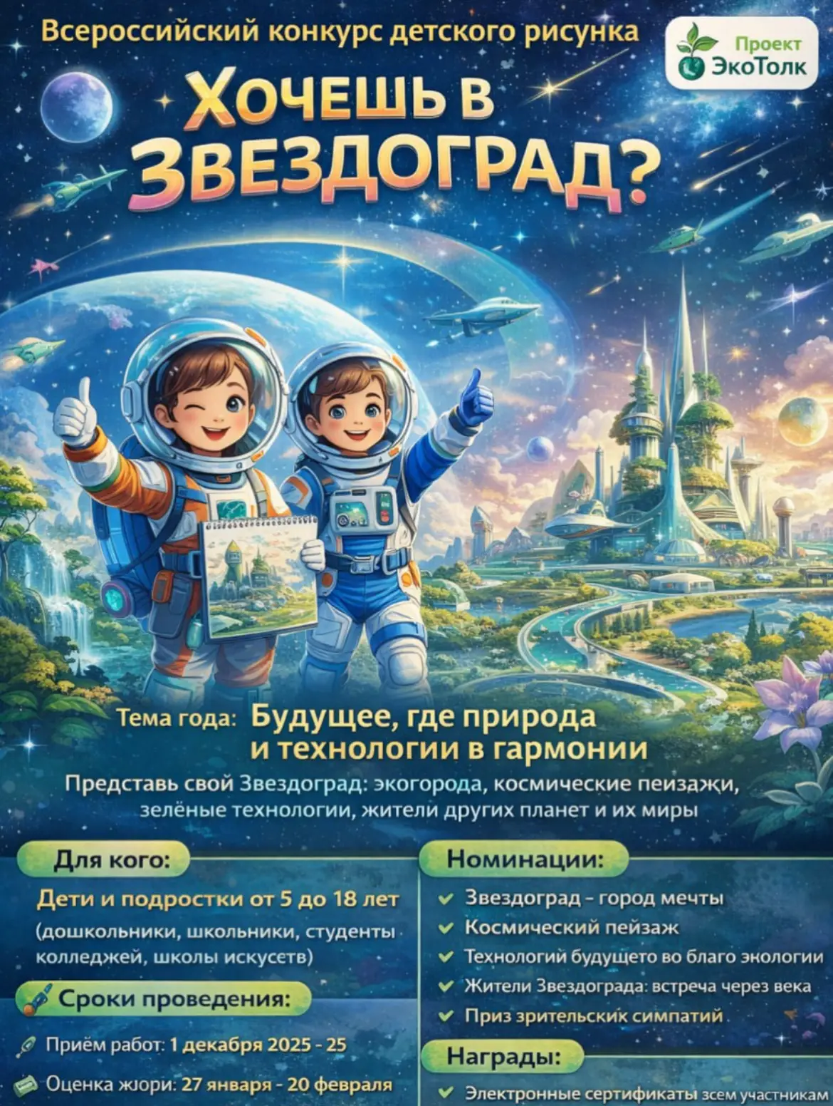 Ассоциация «ЭкоТолк» приглашает школьников и воспитанников детских учреждений к участию во Всероссийском конкурсе рисунков, посвящённом экологии, космосу и будущему 🌍🚀