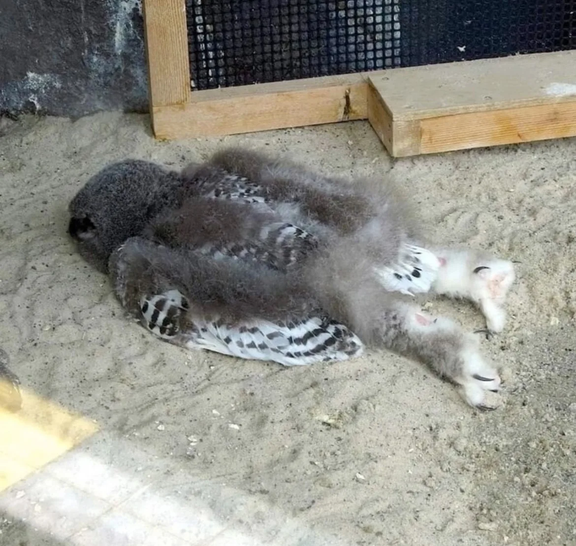 Такая поза удобна птенцам из-за большого веса головы, неокрепших шеи и лапок. Если совята лягут на спину, то могут повредить нежные растущие перья хвоста, а если на бок — то трубочки крыла.