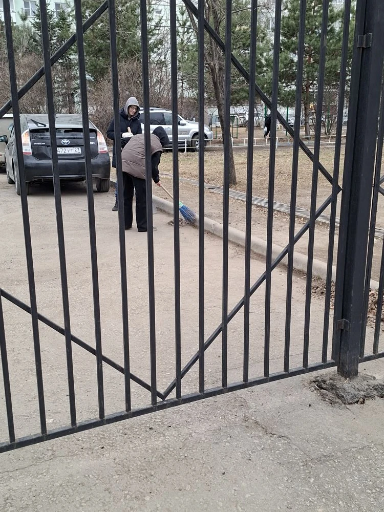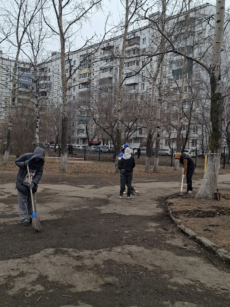 Фронт работ включал всё: от парадного крыльца до дальних кустов за спортплощадкой. Всего полтора часа дружной работы — и газоны освободились от зимнего «наследства», а дорожки стали заметно шире и светлее.