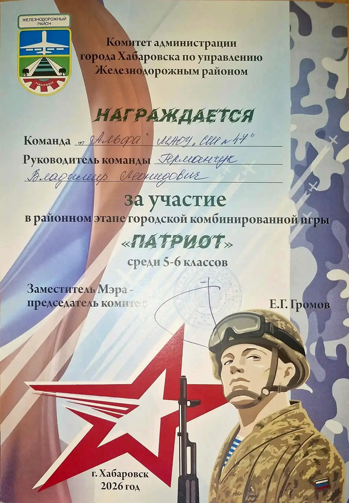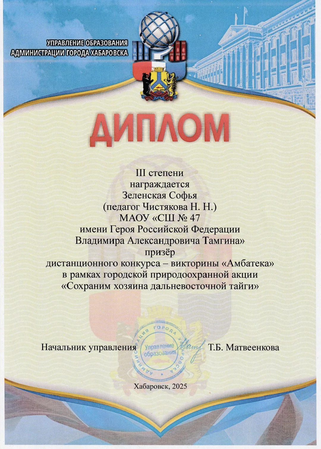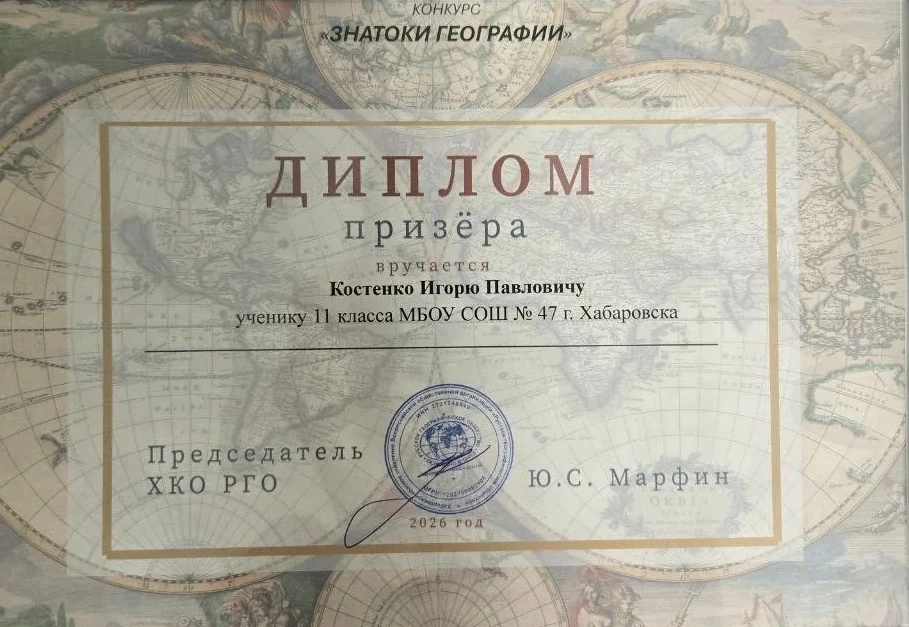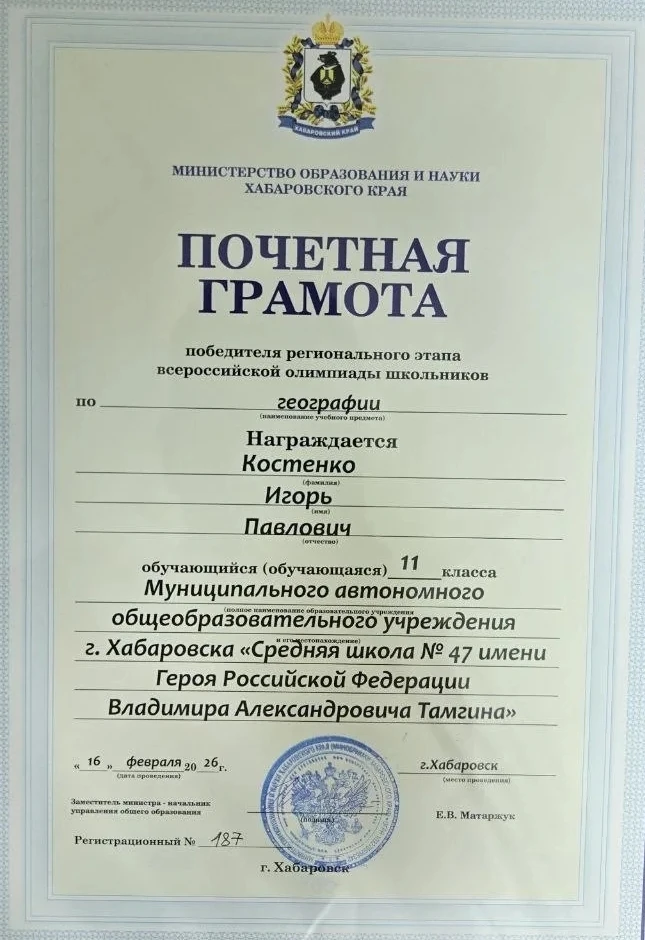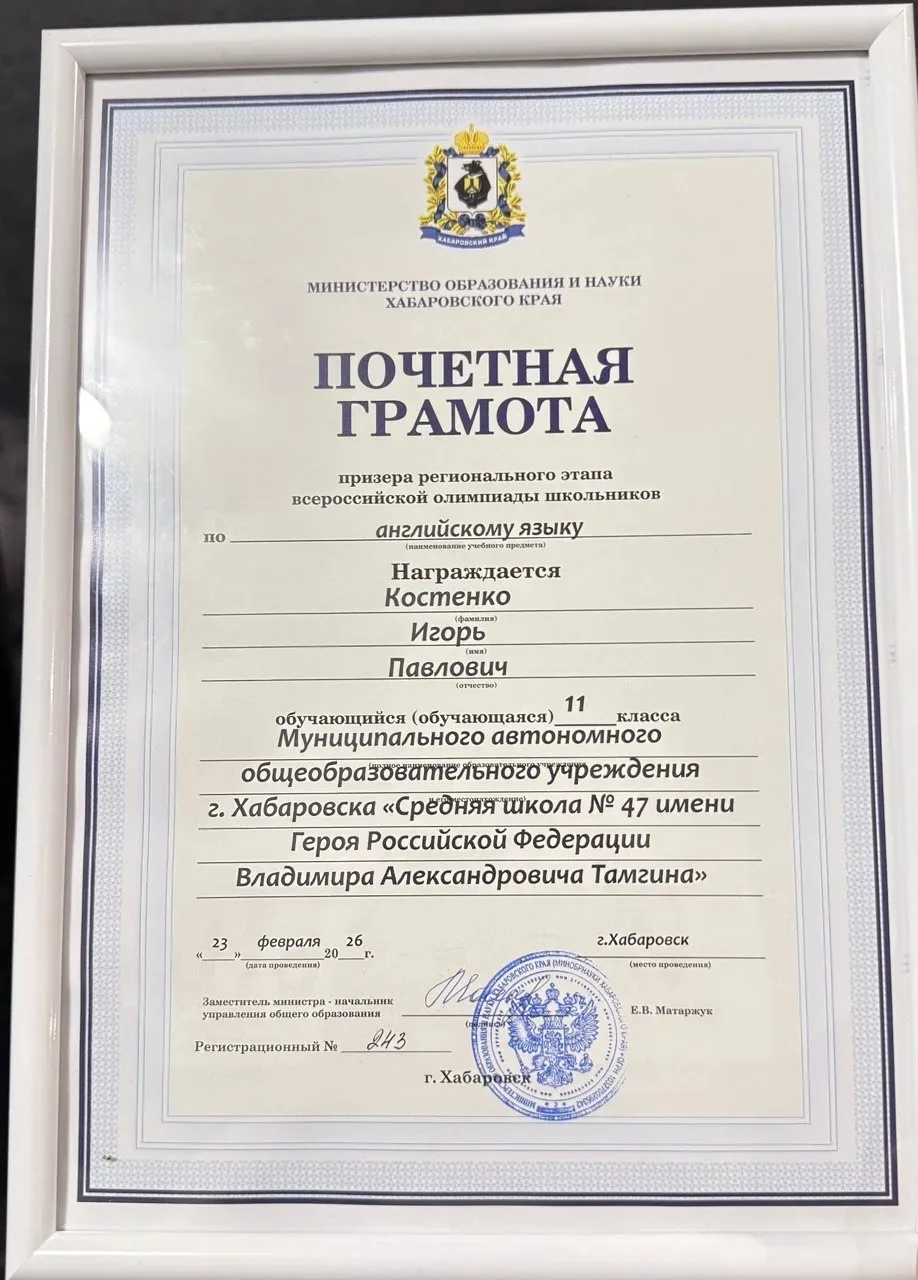 📜 Это достижение зафиксировано официальным дипломом Управления образования Администрации города Хабаровска.
