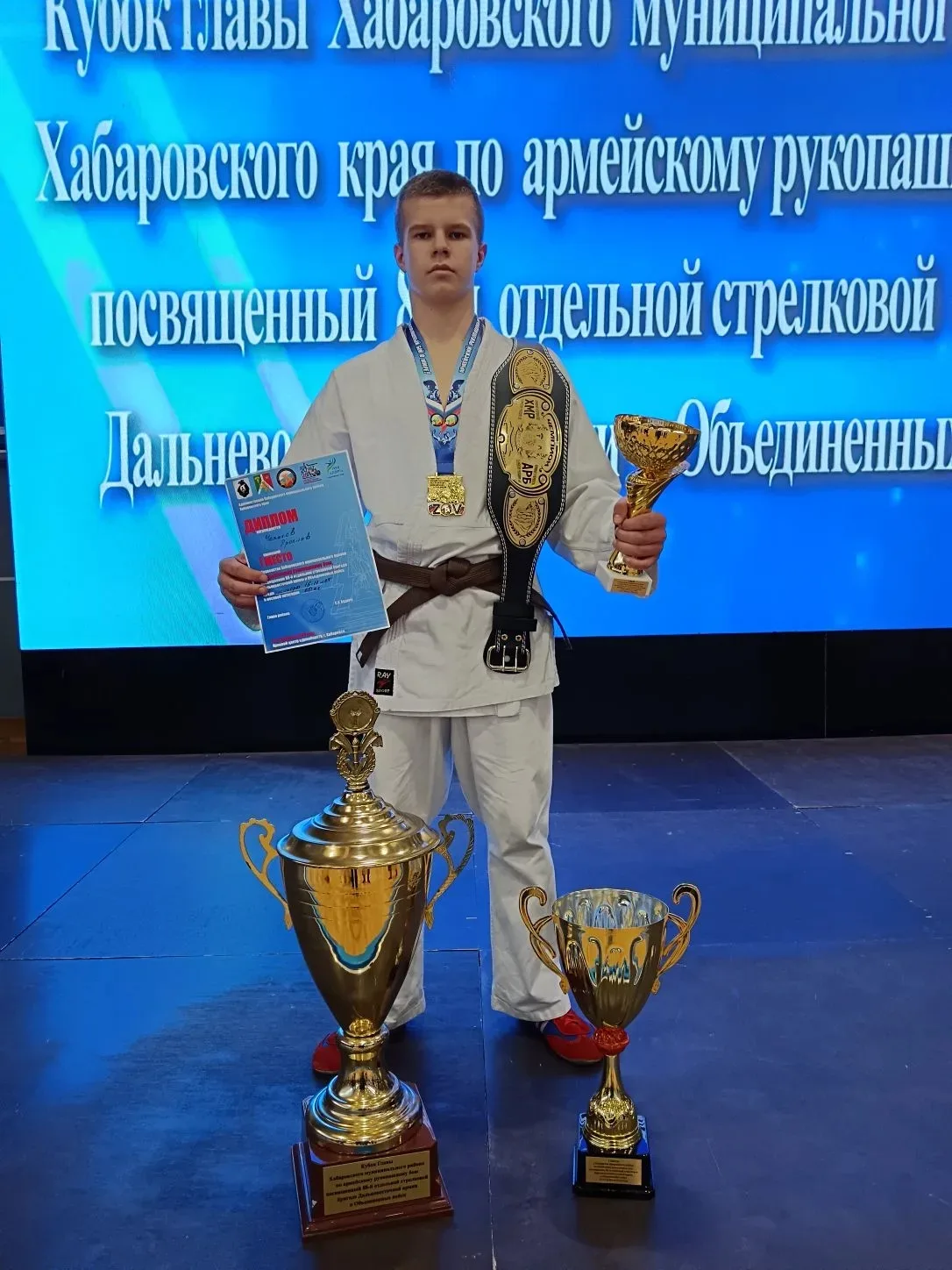 Поздравляем Грибова Игоря, учащегося класса 8.1 нашей школы, с победой в Первенстве Хабаровского муниципального района по армейскому рукопашному бою среди юношей 14-15 лет! 🏆