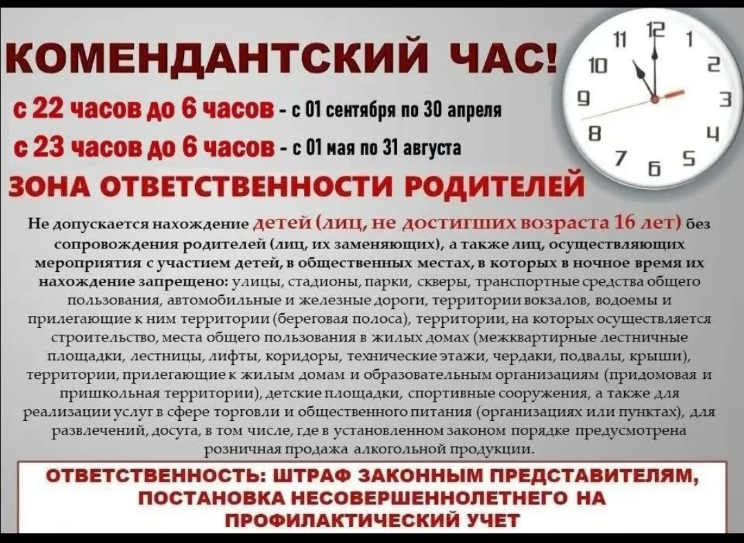По Федеральному закону N 124-ФЗ "Об основных гарантиях прав ребенка в Российской Федерации" (28.04.2023) комендантский час начинается с 22:00 вечера и длится до 6:00 утра следующего дня. Это значит, что подростки до 18 лет могут находиться на улицах и в общественных местах только вне этого времени. Если они находятся на улице после 22:00 или до 6:00 без сопровождения взрослых, это считается нарушением закона.