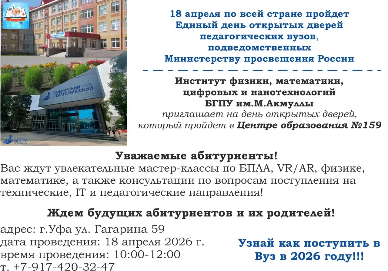 «Центр образования № 159» (ул. Ю.Гагарина, 59) пройдет День открытых дверей института физики, математики, цифровых технологий БГПУ