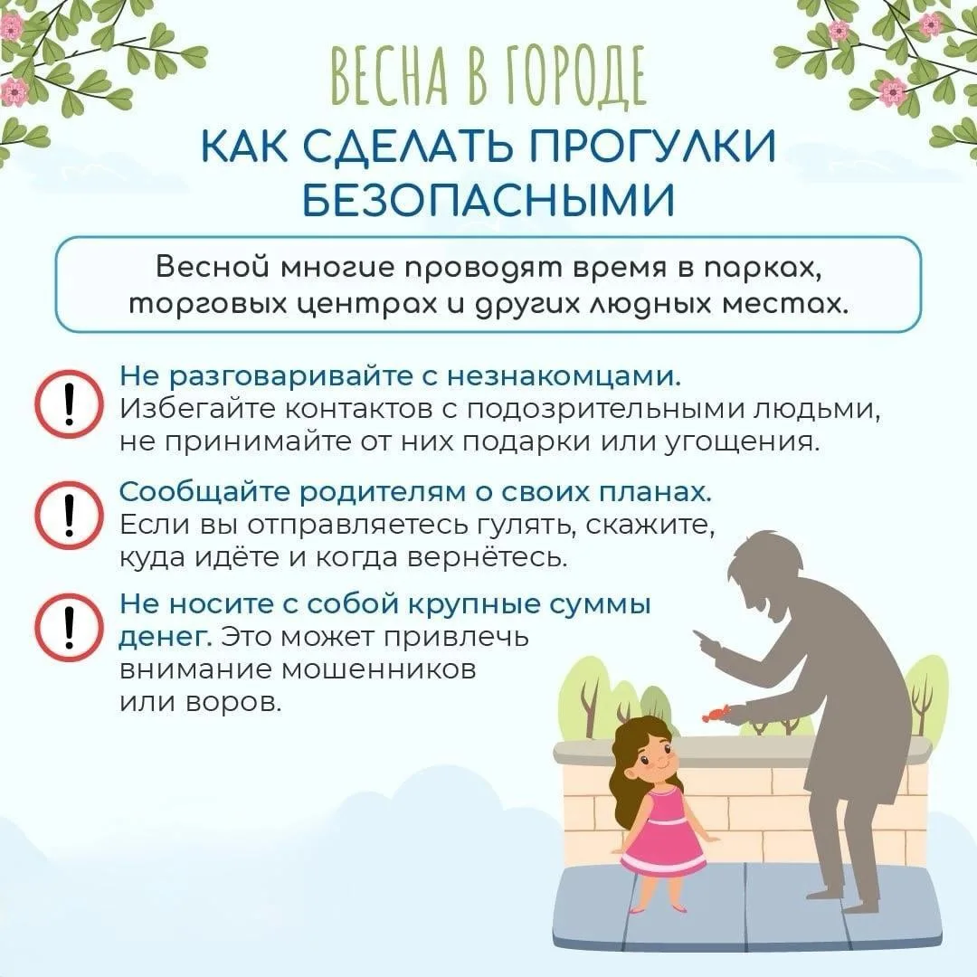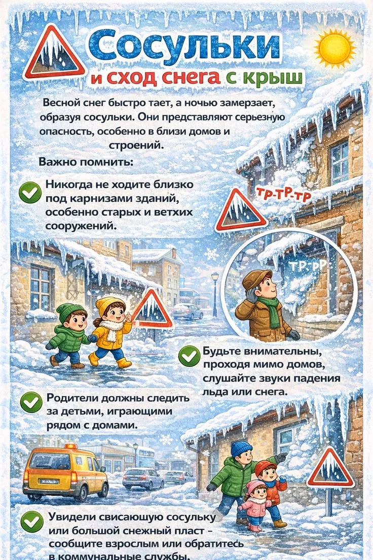 🏠 Осторожнее проходите мимо зданий: весной снег и сосульки часто падают с крыш. Избегайте прогулок вдоль стен домов и фасадов, особенно там, где установлены предупреждающие знаки.