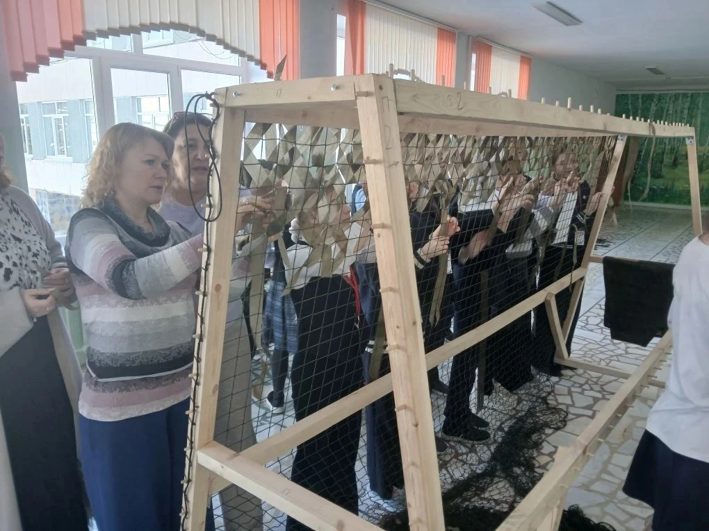 Опытные наставники показали ребятам, как правильно раскроить ткань, выбрать нужный рисунок плетения («зигзаг» или «паучок») и надежно закрепить лоскуты на основе. Маскировочные сети — это расходный материал, который жизненно необходим на передовой для укрытия техники и блиндажей.