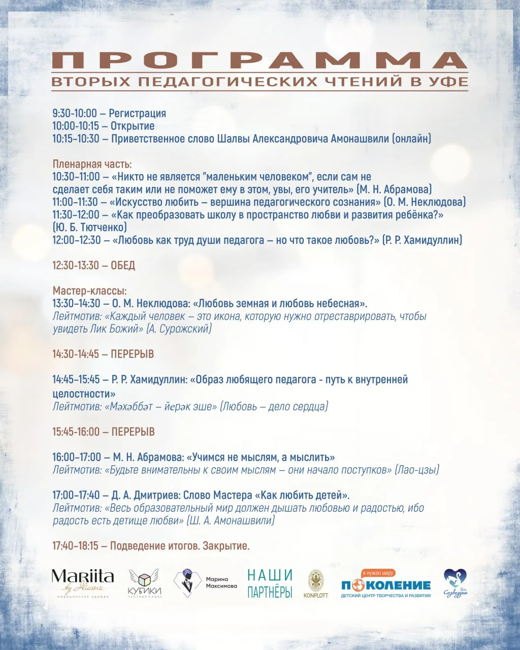 🔹 Пленарные выступления ведущих специалистов в области гуманной педагогики из Москвы, Санкт-Петербурга, Екатеринбурга, Альметьевска и Уфы.