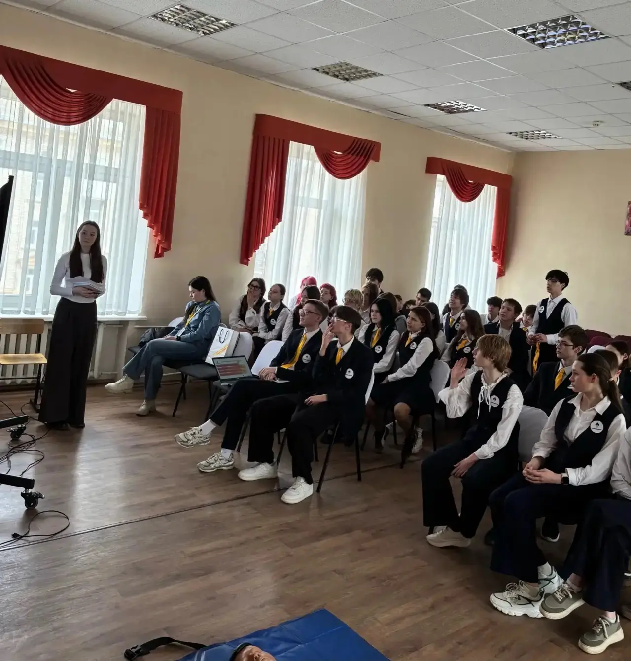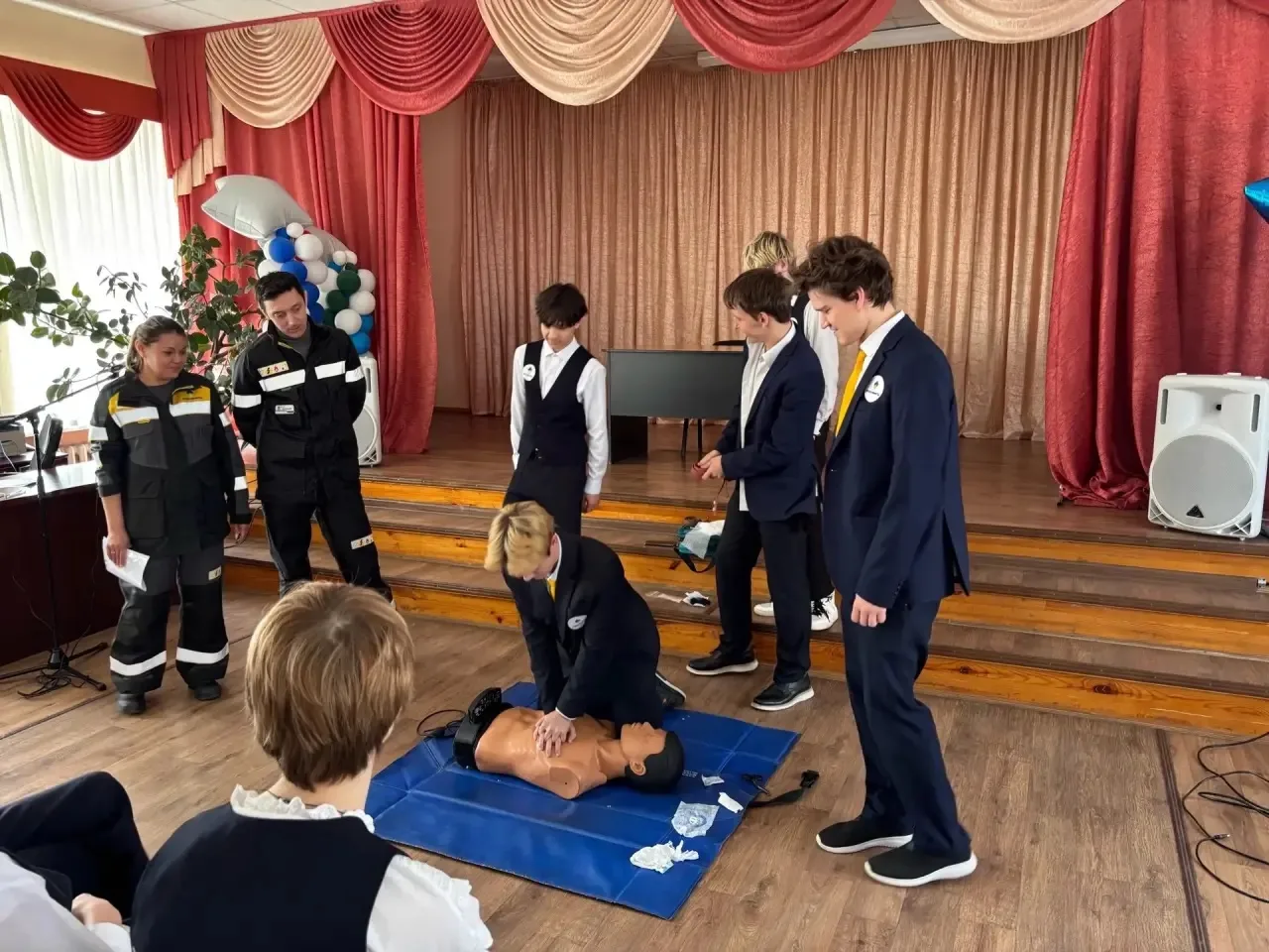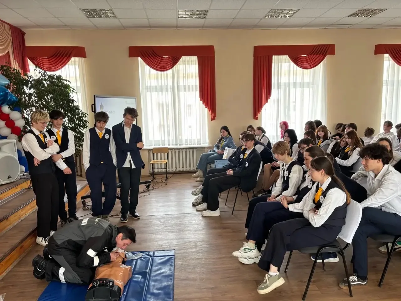 💯Самой динамичной частью стал мастер-класс по оказанию первой помощи. Под руководством профессионалов ребята отработали алгоритмы оказания первой доврачебной помощи. Используя специальный манекен-тренажер «Гошу», старшеклассники практиковались в проведении сердечно-легочной реанимации и отрабатывали правила остановки кровотечений.