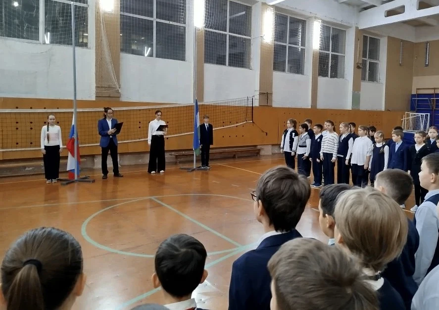 Новая учебная четверть в нашей школе началась с традиционной торжественной церемонии поднятия государственных флагов Российской Федерации и Республики Башкортостан и исполнения гимнов.