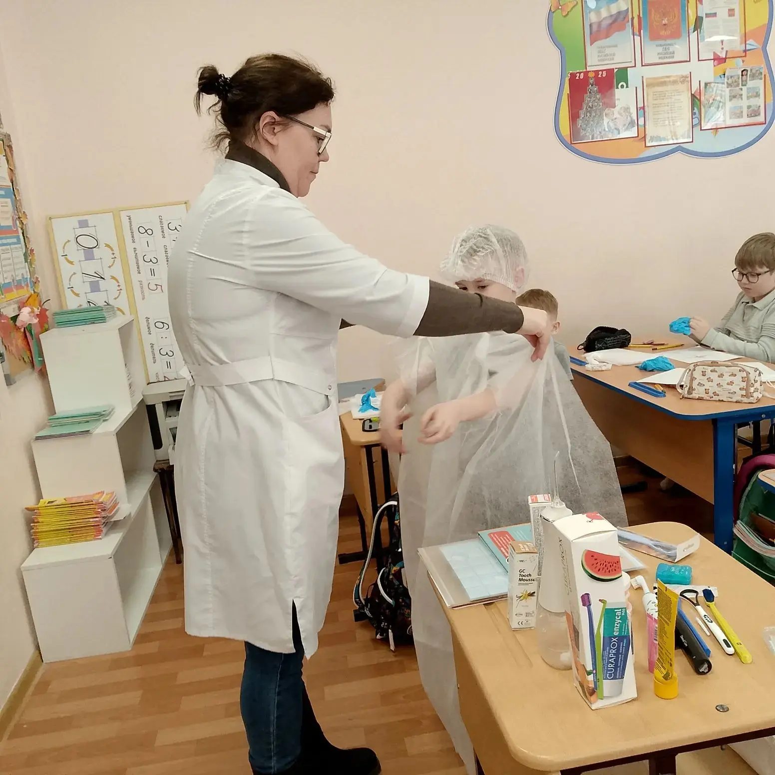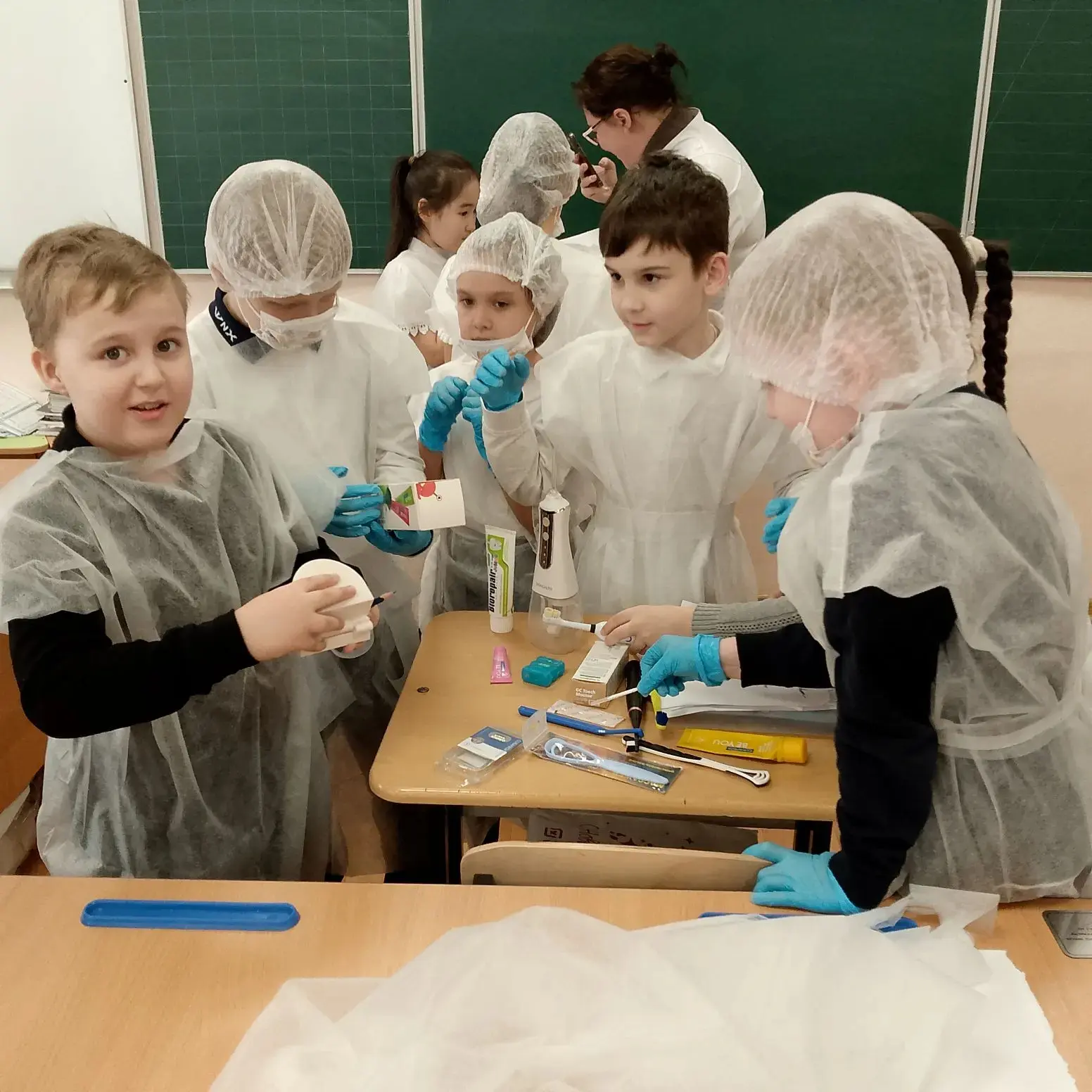 Самым интересным этапом стала «примерка» профессии. Ребята с огромным удовольствием перевоплощались в настоящих докторов: надевали белые халаты, шапочки и маски. Почувствовав себя специалистами, юные медики с энтузиазмом приступили к практике — учились правильно чистить зубы на макетах.