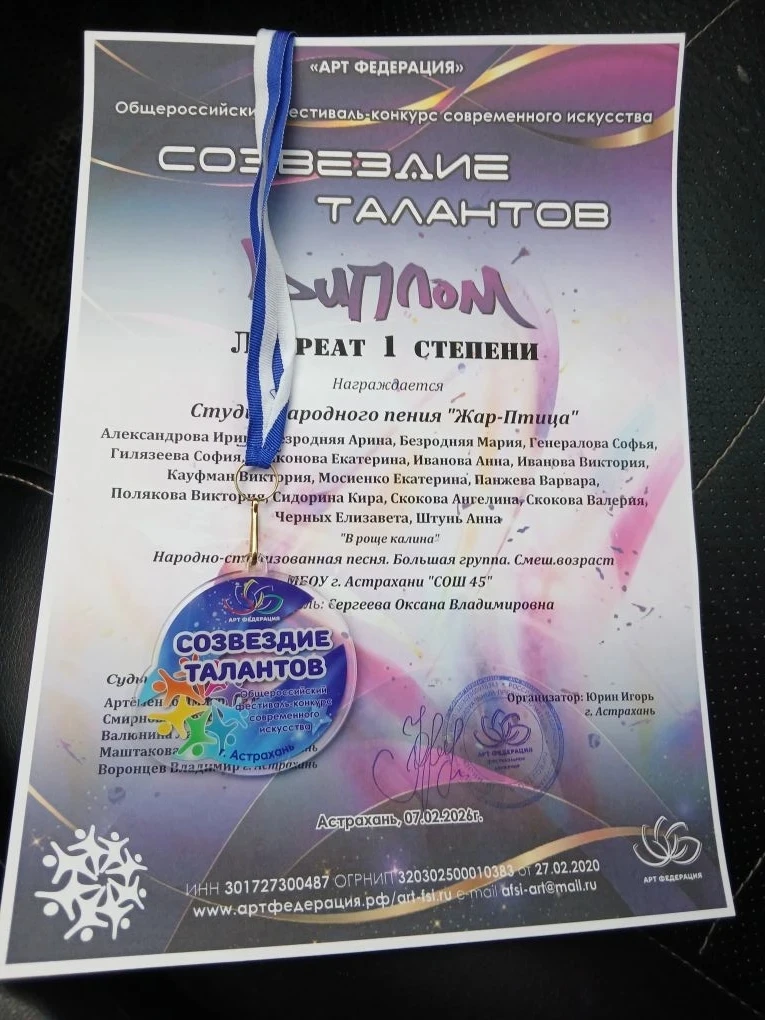 7 февраля 2026 года в Доме офицеров Каспийской флотилии (г. Астрахань) состоялся Общероссийский фестиваль-конкурс современного искусства «Созвездие талантов». Мероприятие собрало одарённых исполнителей , чтобы выявить лучших из лучших.