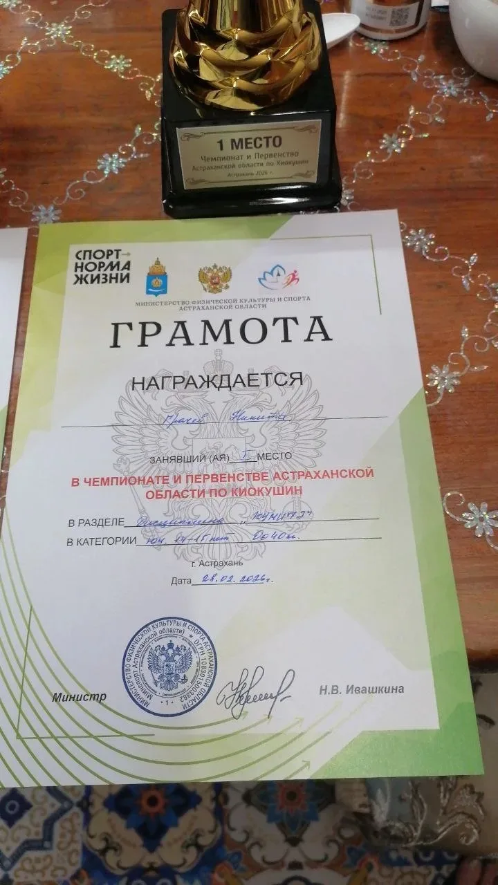 28 февраля в Астрахани прошли Чемпионат и Первенство Астраханской области по киокушинкай (дисциплина «кумитэ»). Честь нашей школы на этих соревнованиях защищал ученик 7В класса — Грачев Никита.