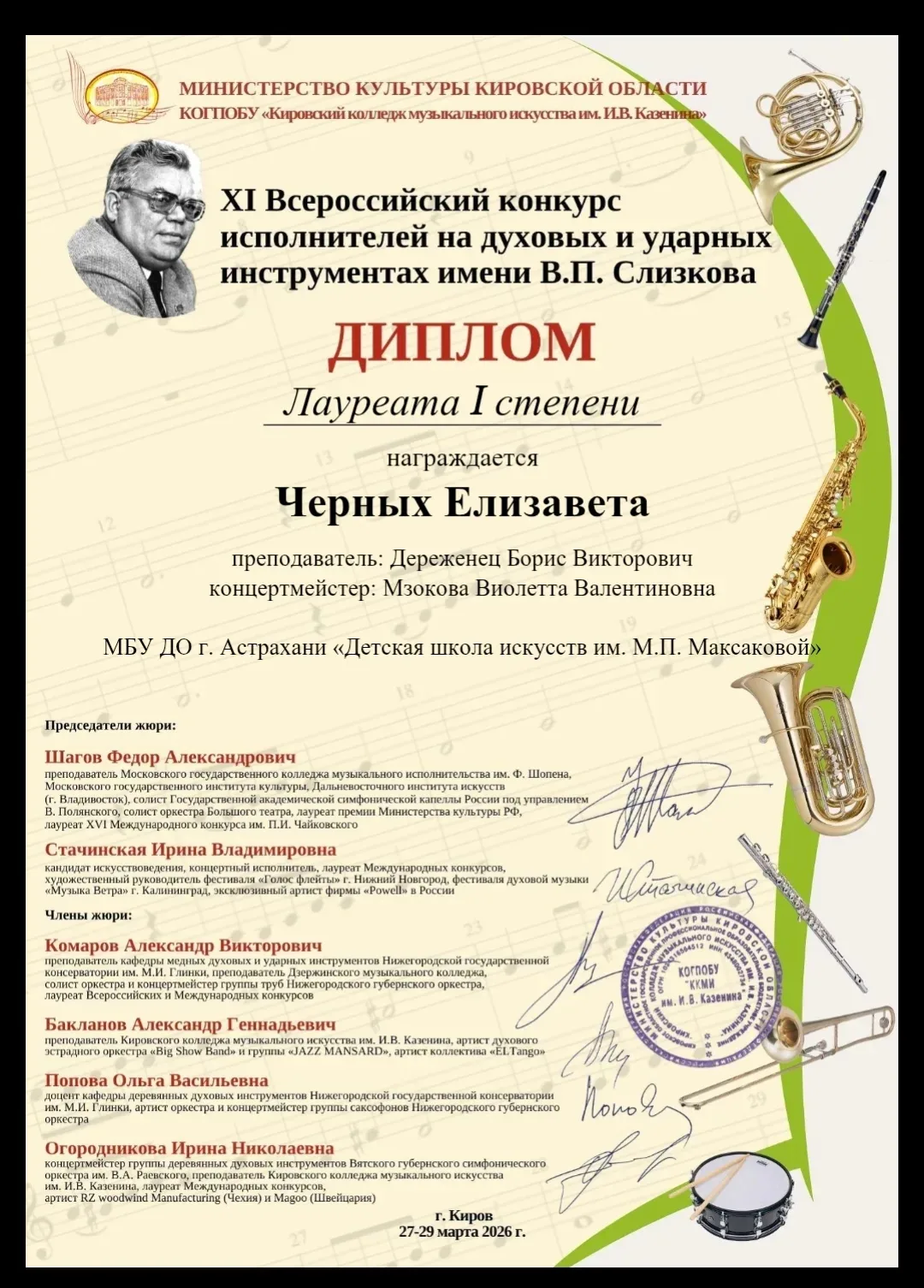 На XI Всероссийском конкурсе исполнителей на духовых и ударных инструментах имени В.П. Слизкова наша ученица 4 Г класса Елизавета Черных завоевала звание Лауреата I степени!