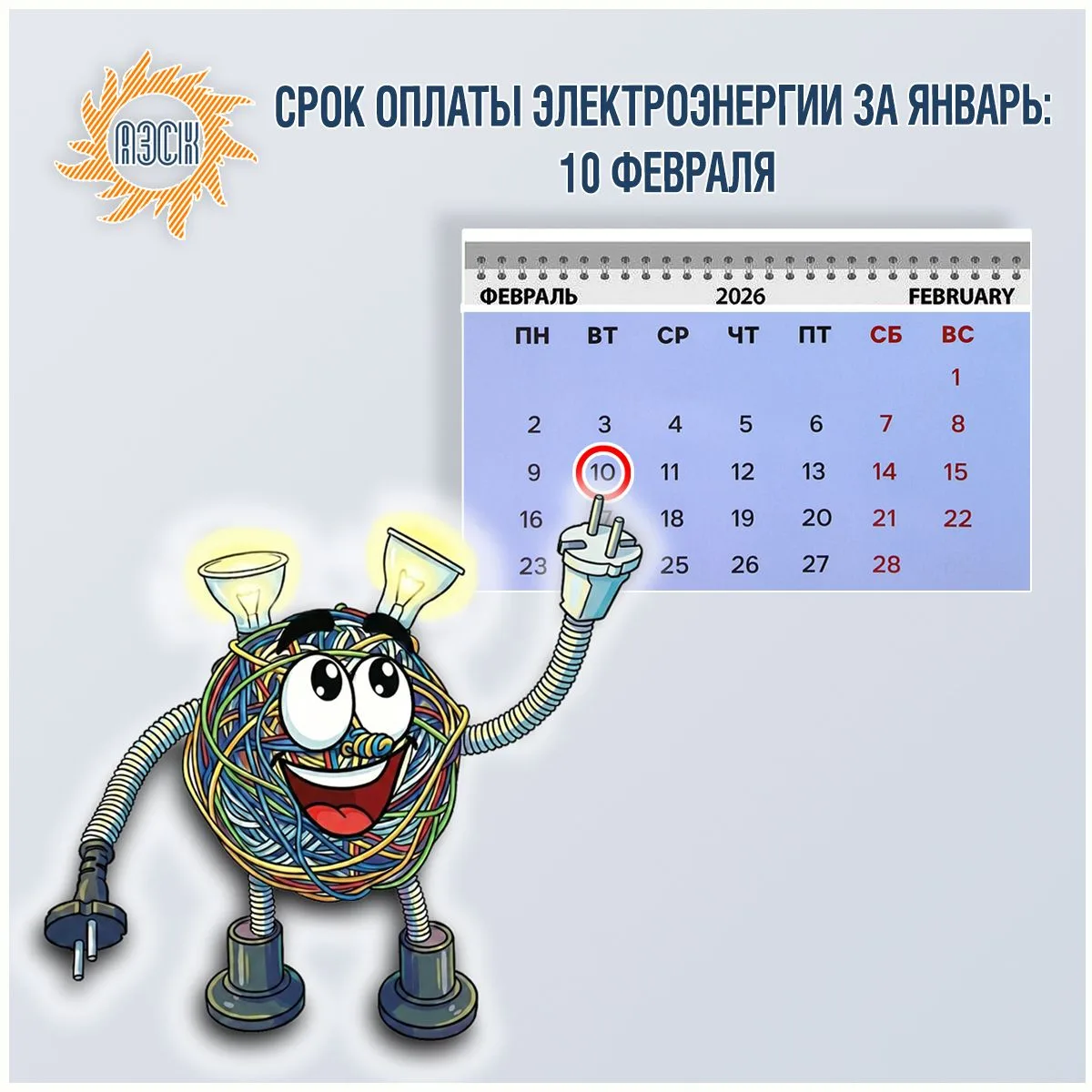 ПАО «Астраханская энергосбытовая компания» напоминает о необходимости до 10 февраля 2026 года оплатить услугу по электроснабжению за январь 2026 года.