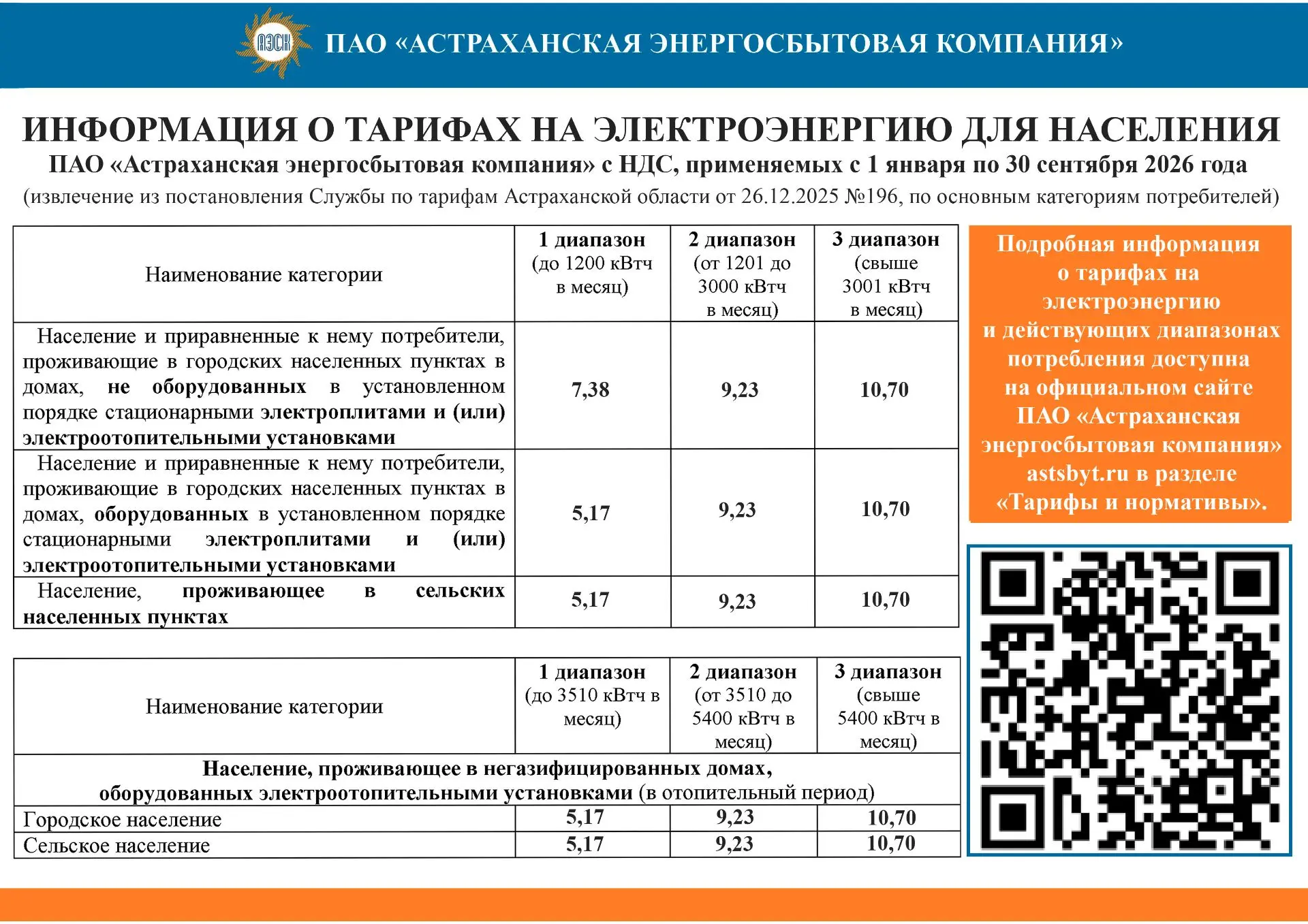С 1 января 2026 года вступили в силу новые тарифы на электроэнергию, утвержденные постановлением Службы по тарифам Астраханской области от 26.12.2025 №196. Данные тарифы будут действовать по 30 сентября 2026 года. Новый тариф, применяемый по вашему адресу, будет указан в январской квитанции на оплату.