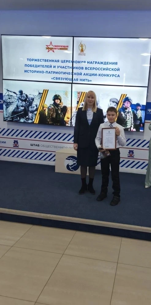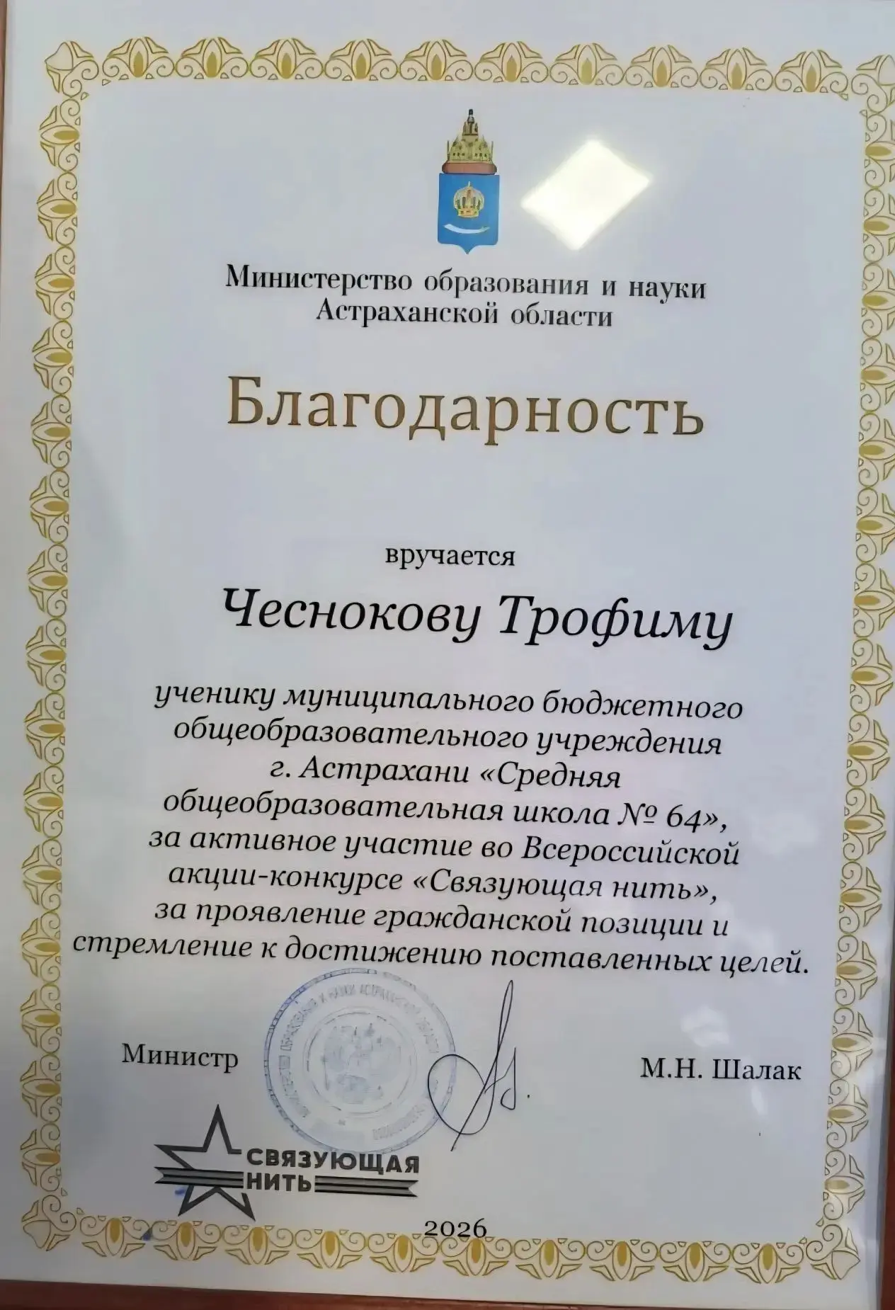 🔹12 февраля в штабе ЕДИНОЙ РОССИИ чествовали победителей акции - конкурса СВЯЗУЮЩАЯ НИТЬ. НА конкурс поступило более 15000 заявок и работ. Астраханская область выглядела очень достойно. 30 лучших работ нашего региона отобраны, проверены, оценены. В их число вошёл ученик 4В класса ЧЕСНОКОВ ТРОФИМ, описавший боевой путь и подвиг своего прадеда.