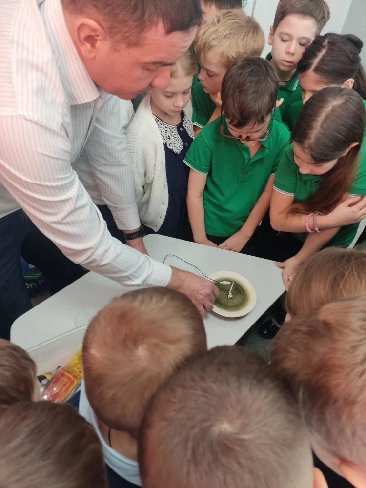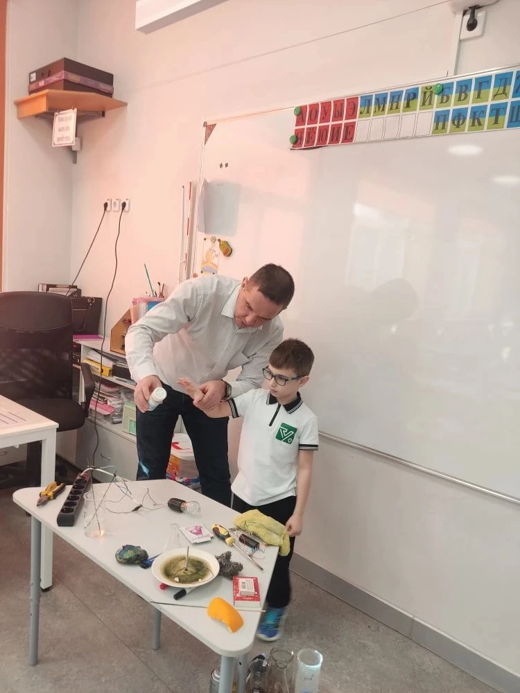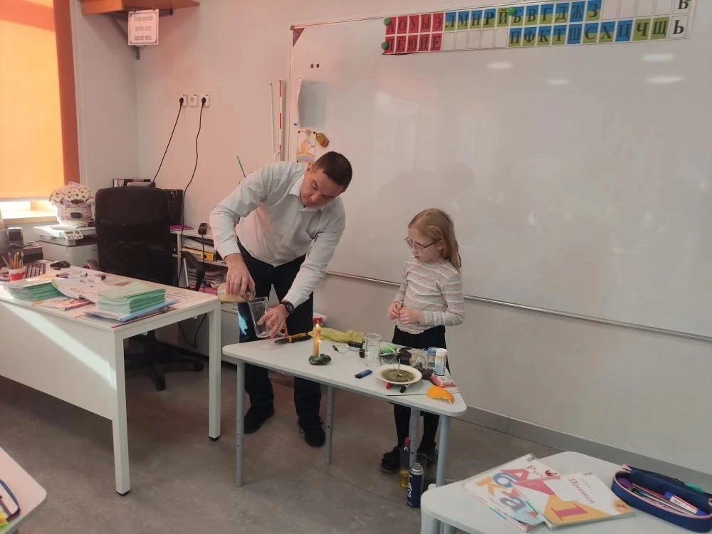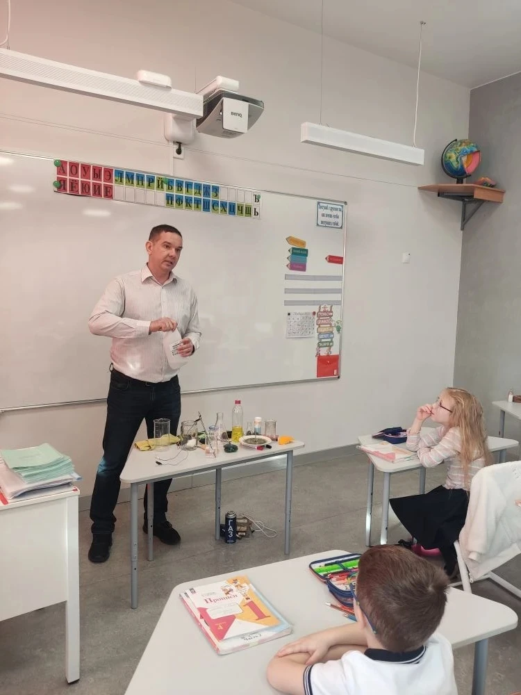 В рамках проекта «Экспериментариум» для ребят из 1 «А» класса прошёл урок окружающего мира «Кислород — активный химический элемент», который провёл учитель физики — Максим Владимирович Всяких. 🧑🔬