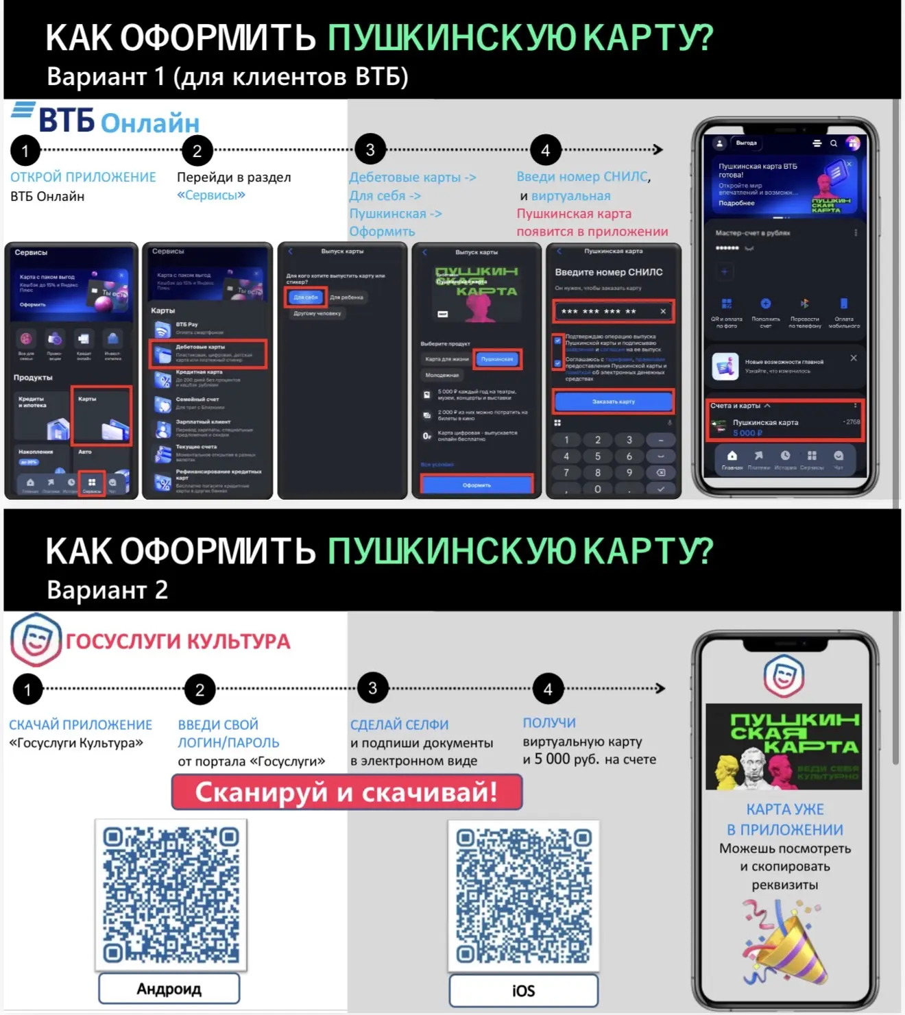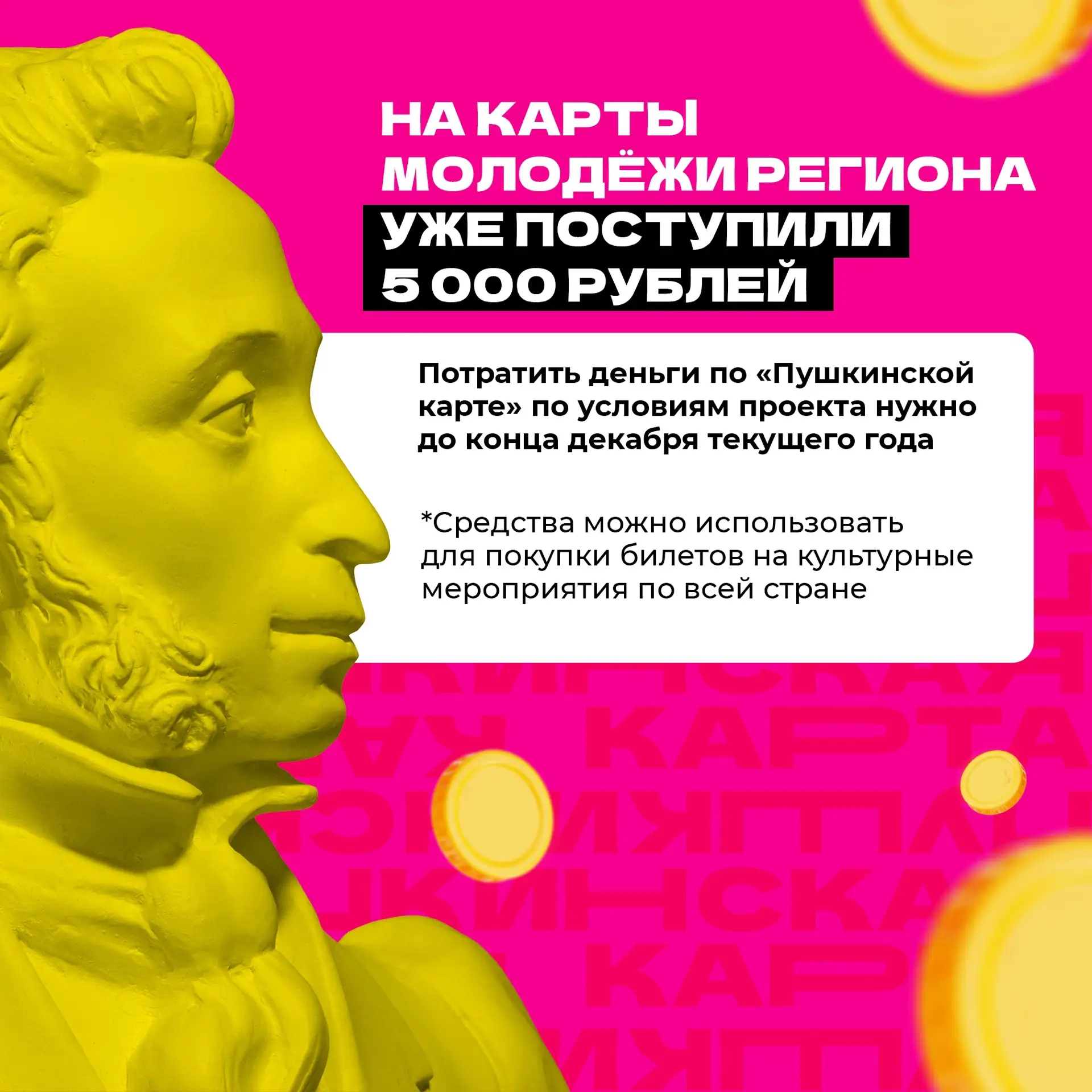На карты участников проекта уже зачислено 5 тысяч рублей. До конца текущего года молодежь может использовать эти средства для приобретения билетов на любые культурные события. При этом, на посещение кинотеатров можно направить до 2 тысяч рублей.