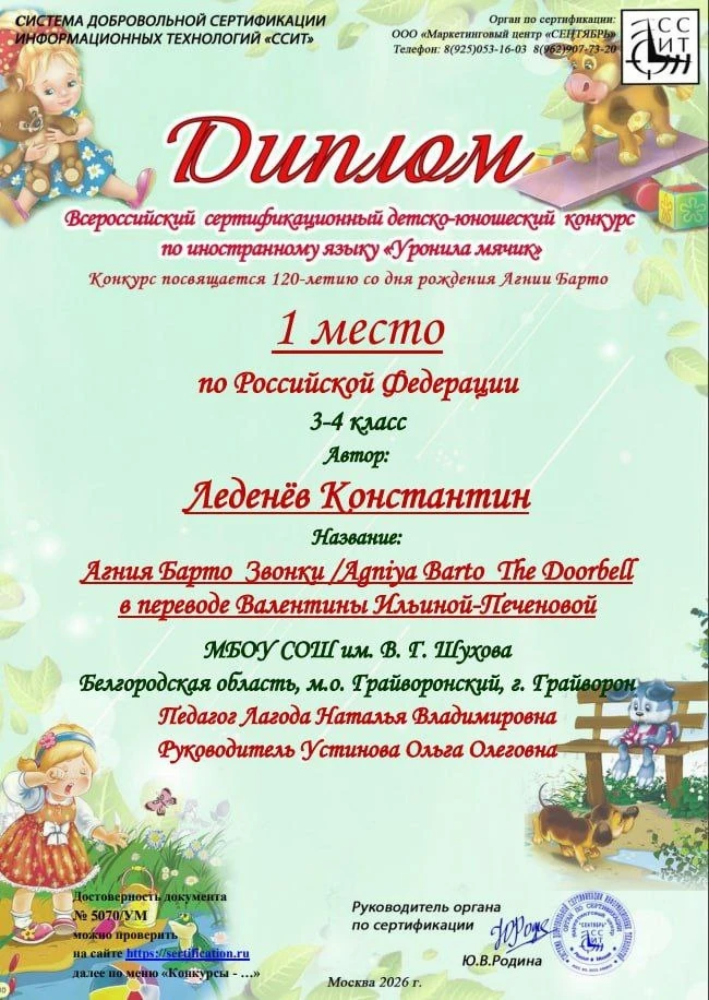 Поздравляем Леденёва Константина, ученика 3 класса, и учителя иностранного языка, Лагода Наталью, с блестящей победой во всероссийском конкурсе по иностранному языку! Конкурс, посвященный 120-летию со дня рождения великой советской поэтессы Агнии Львовны Барто, собрал юные таланты со всей страны, и Костя сумел достойно представить свою работу, заняв почетное первое место.
