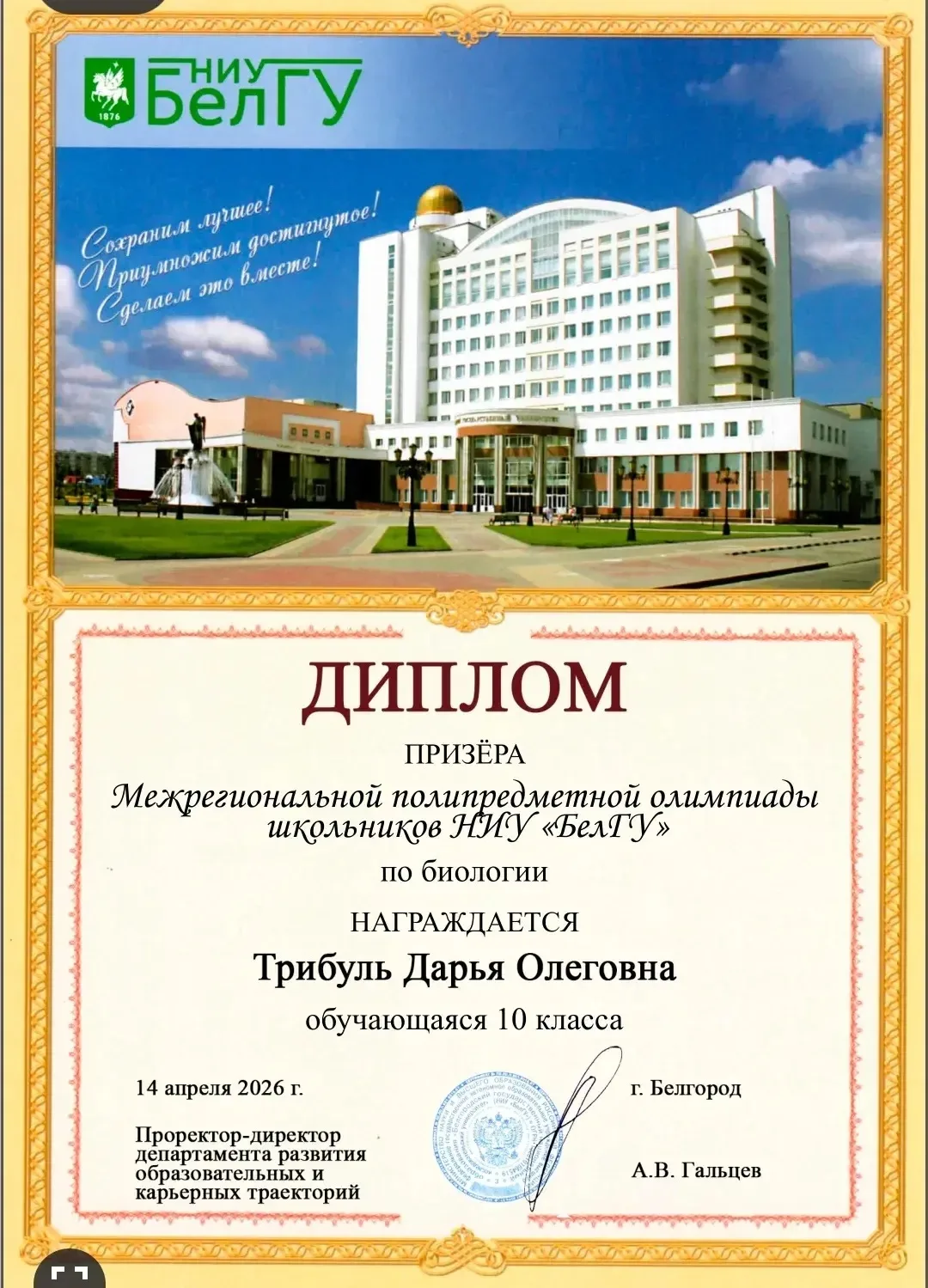 💫 Обучающаяся профильного медицинского 10 «Б» класса МБОУ «СОШ 1 с УИОП имени Княжны Ольги Николаевны Романовой Трибуль Дарья стала призёром 2 степени Межрегиональной полипредметной олимпиады школьников (МПОШ) от НИУ «БелГУ» по биологии! 🔥