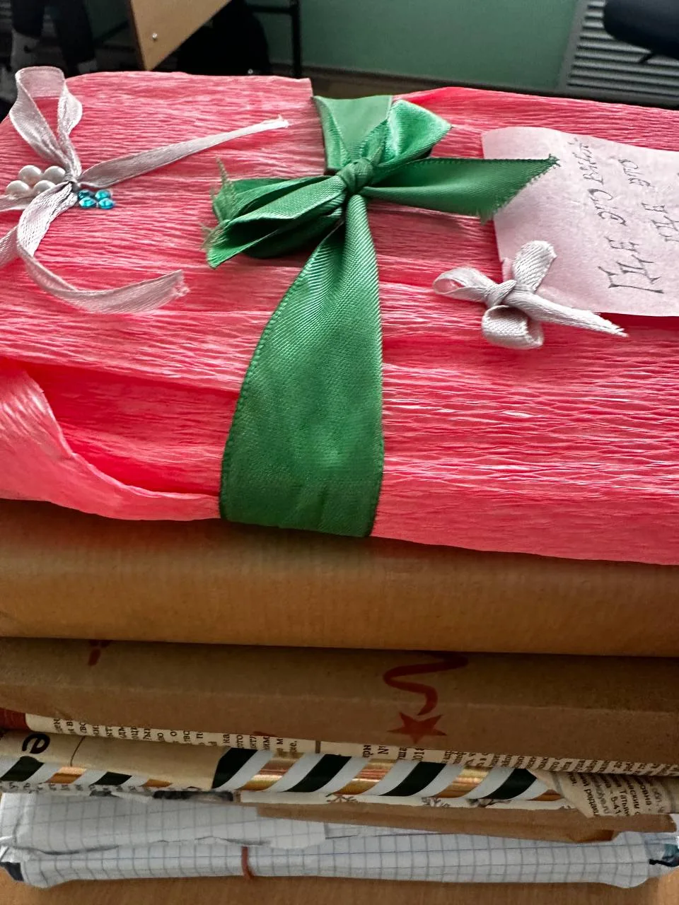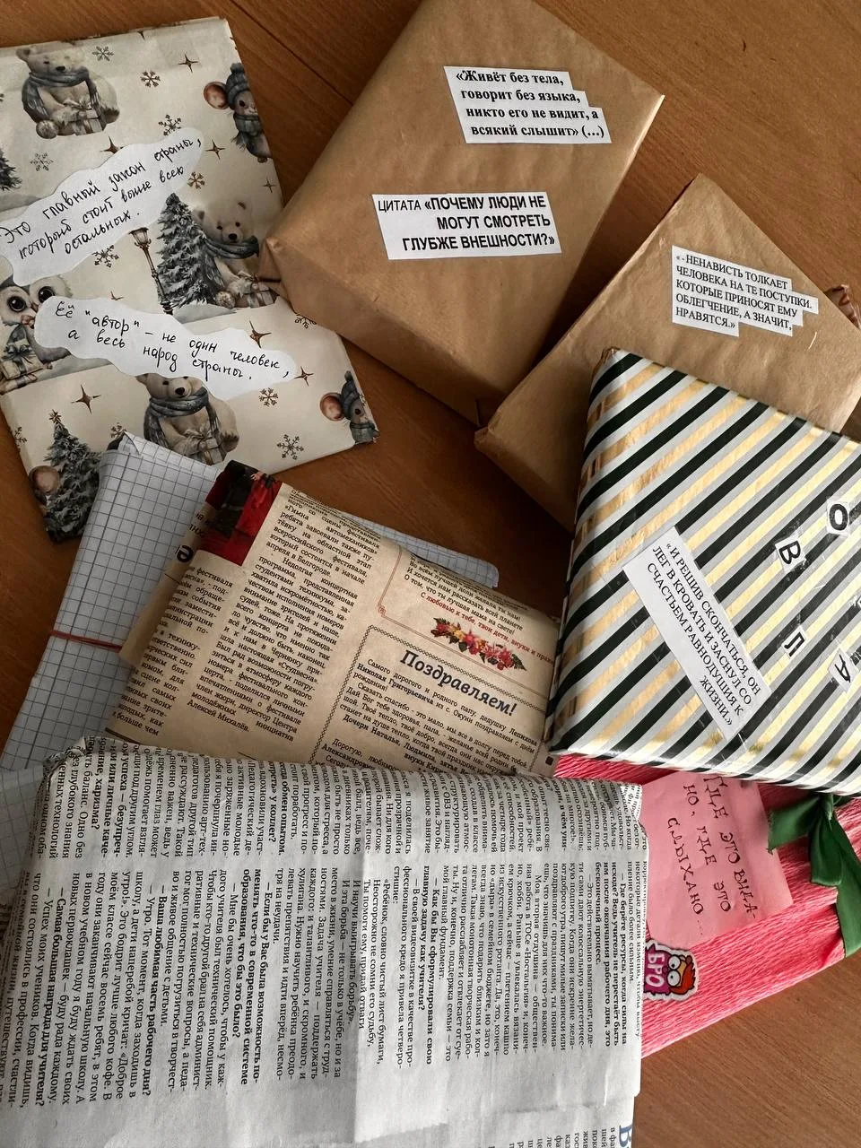 Каждая книга была бережно обвернута в бумагу, так чтобы не было видно ни автора, ни названия книги, только тезисы, цитаты, ребусы и загадки помогали разгадать тайну названия произведения.
