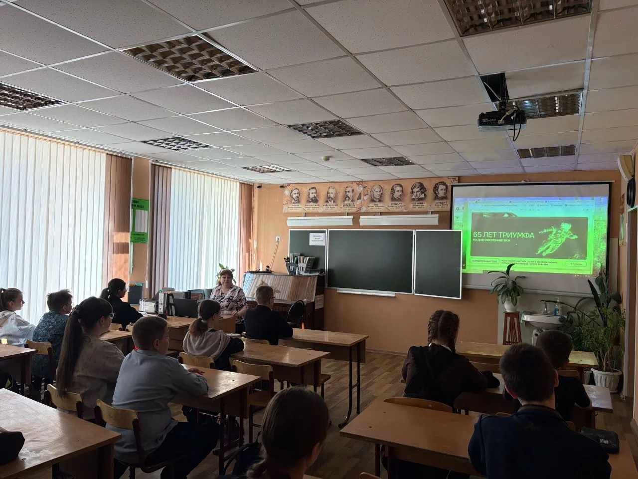 Понедельник для всей школы начался с особенного занятия из цикла внеурочной деятельности — «Разговоры о важном». И тема была просто космической: «65 лет триумфа ко Дню космонавтики»!