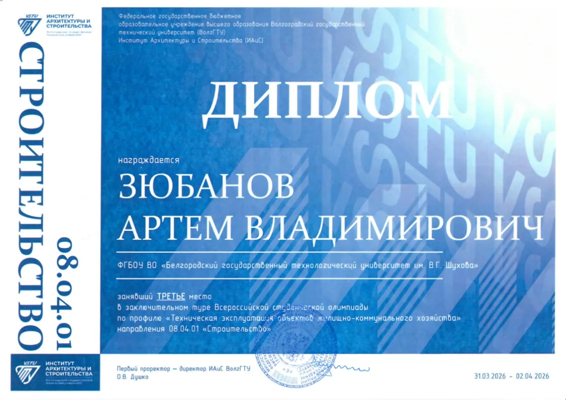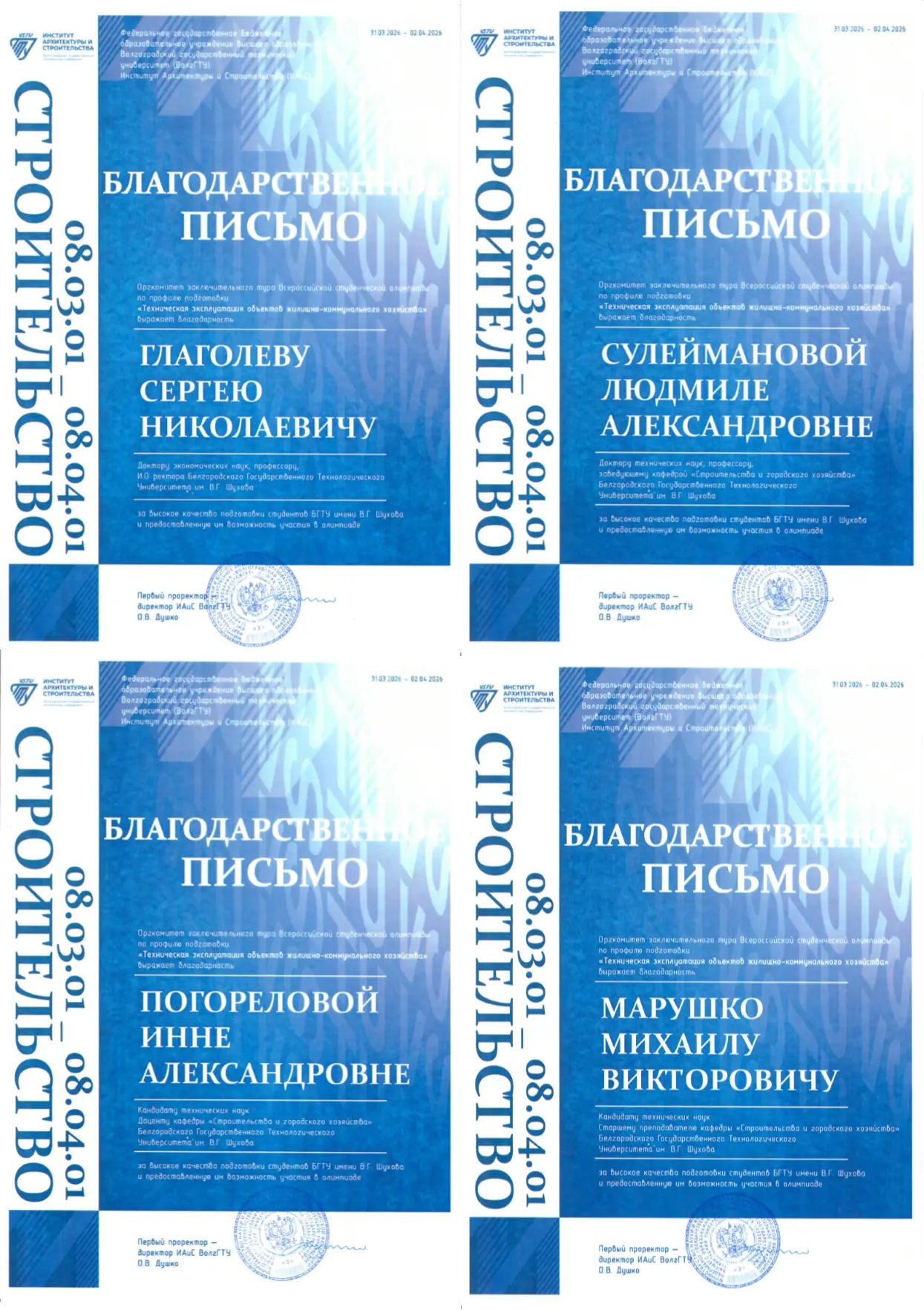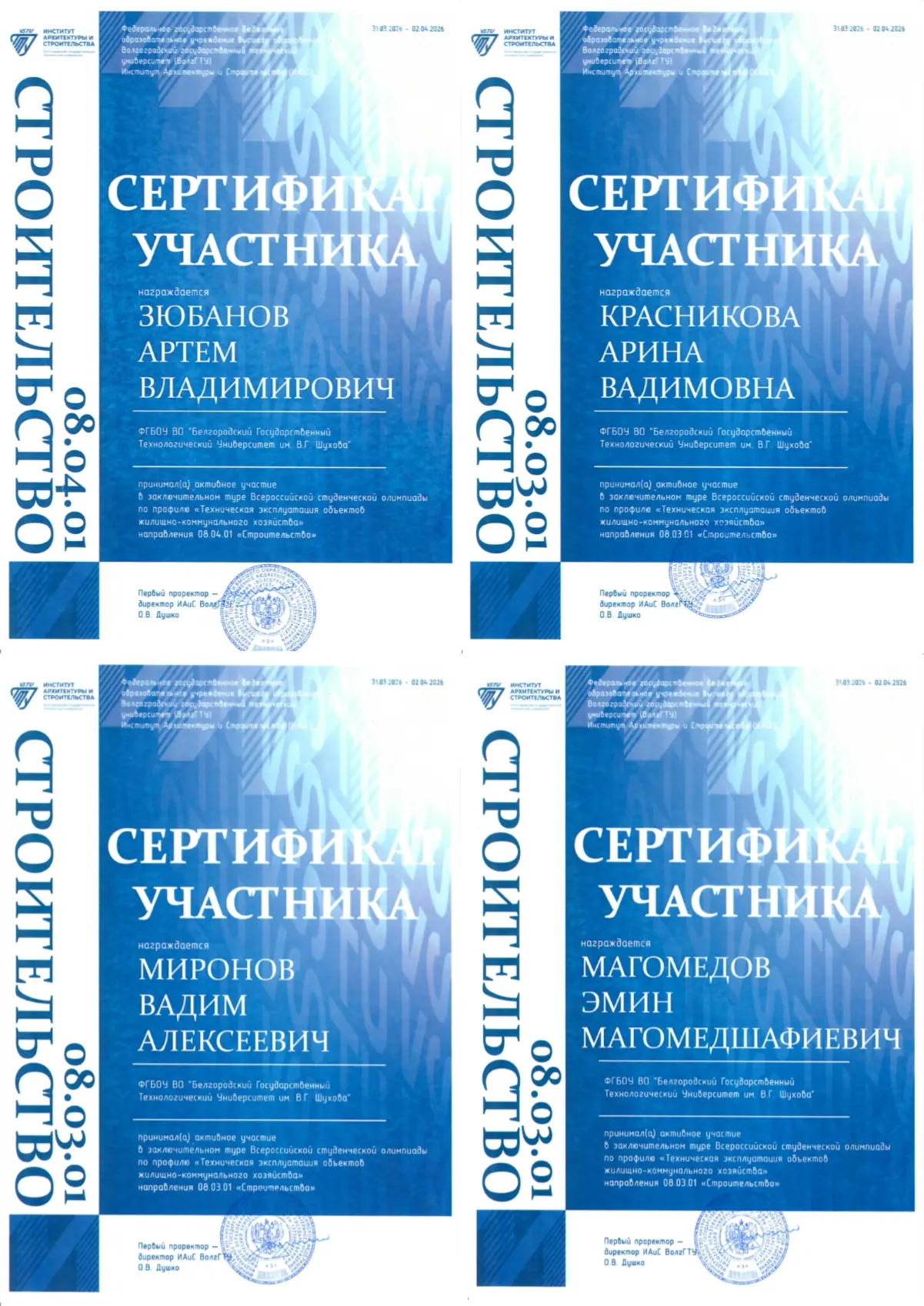 2 апреля завершился заключительный тур Всероссийской студенческой олимпиады по профилю «Техническая эксплуатация объектов жилищно-коммунального хозяйства» на базе Института архитектуры и строительства ВолгГТУ. В олимпиаде приняли участие студенты бакалавриата и магистратуры кафедры строительства и городского хозяйства БГТУ им. В.Г. Шухова: Эмин Магомедов, Арина Красникова, Вадим Миронов и Артём Зюбанов.