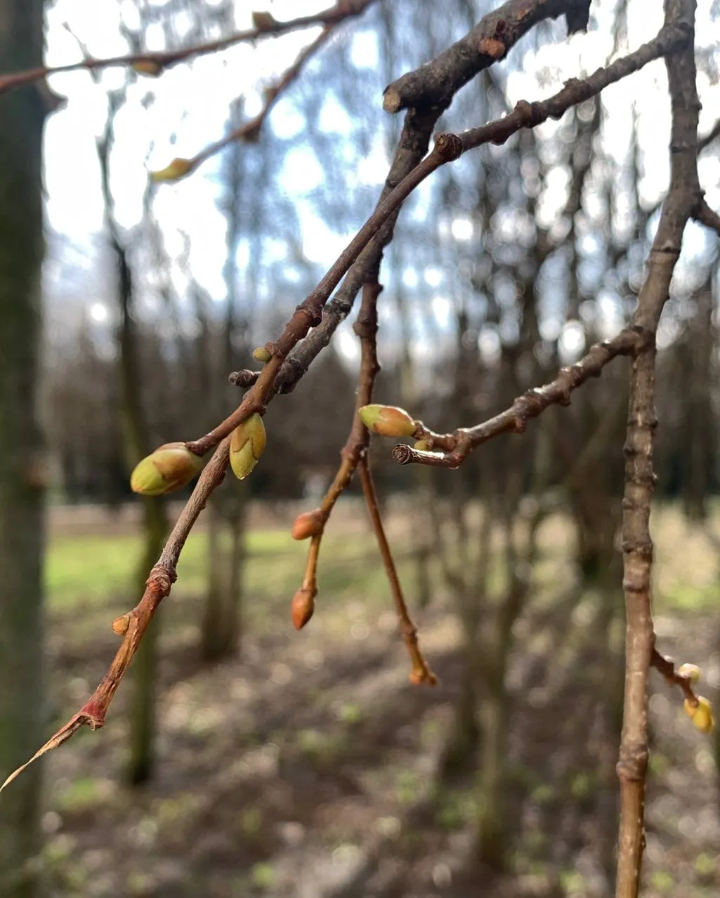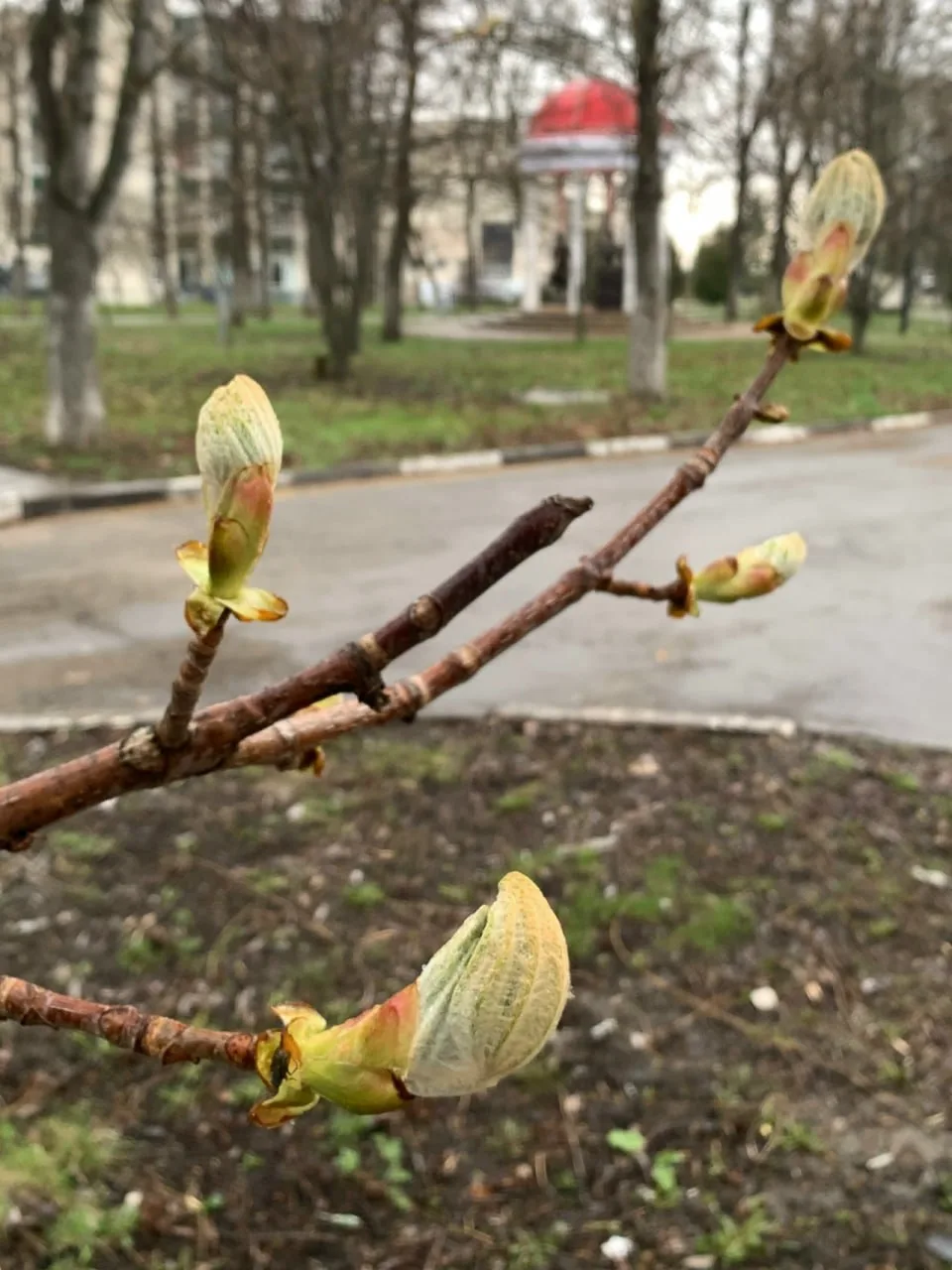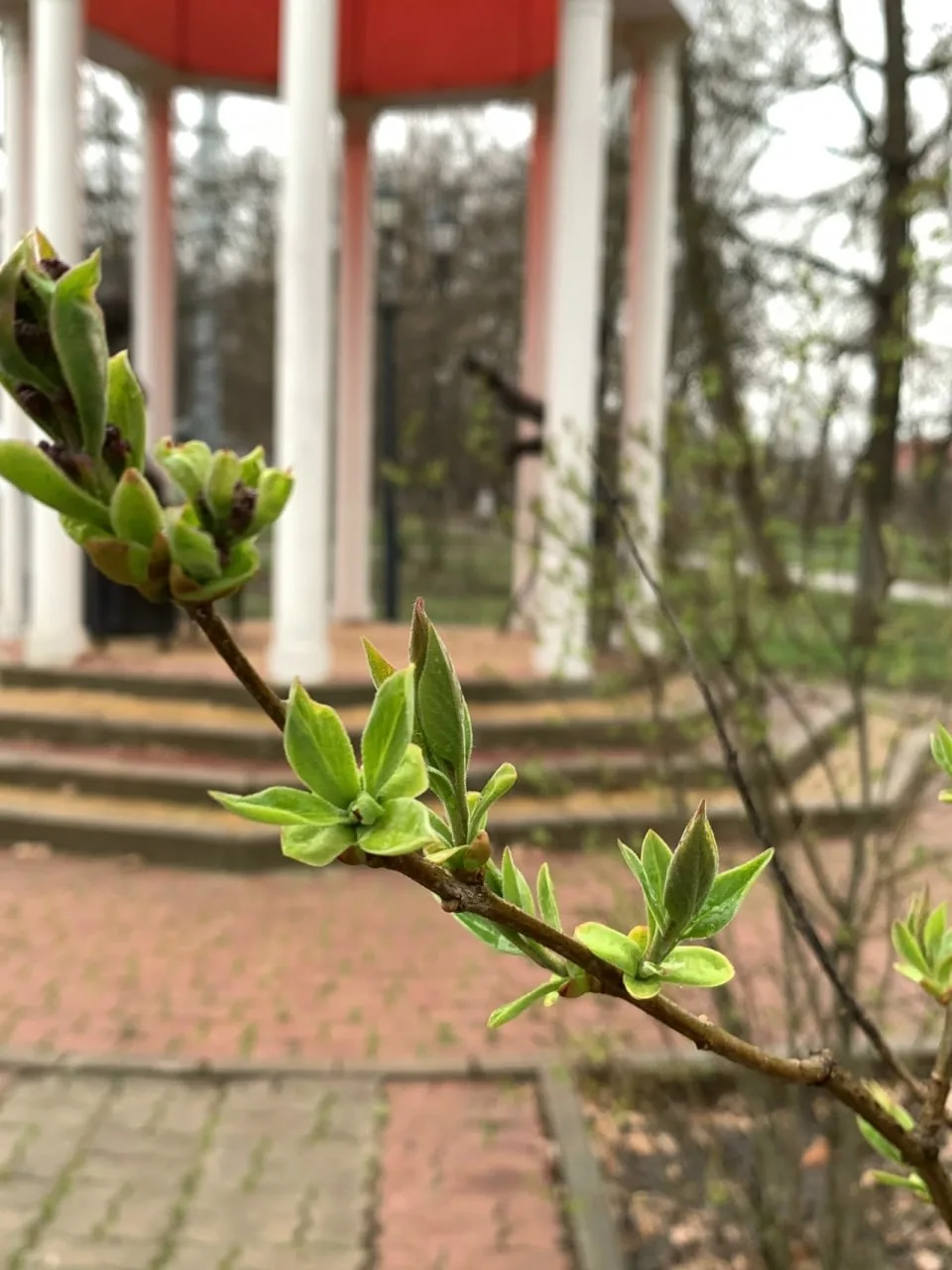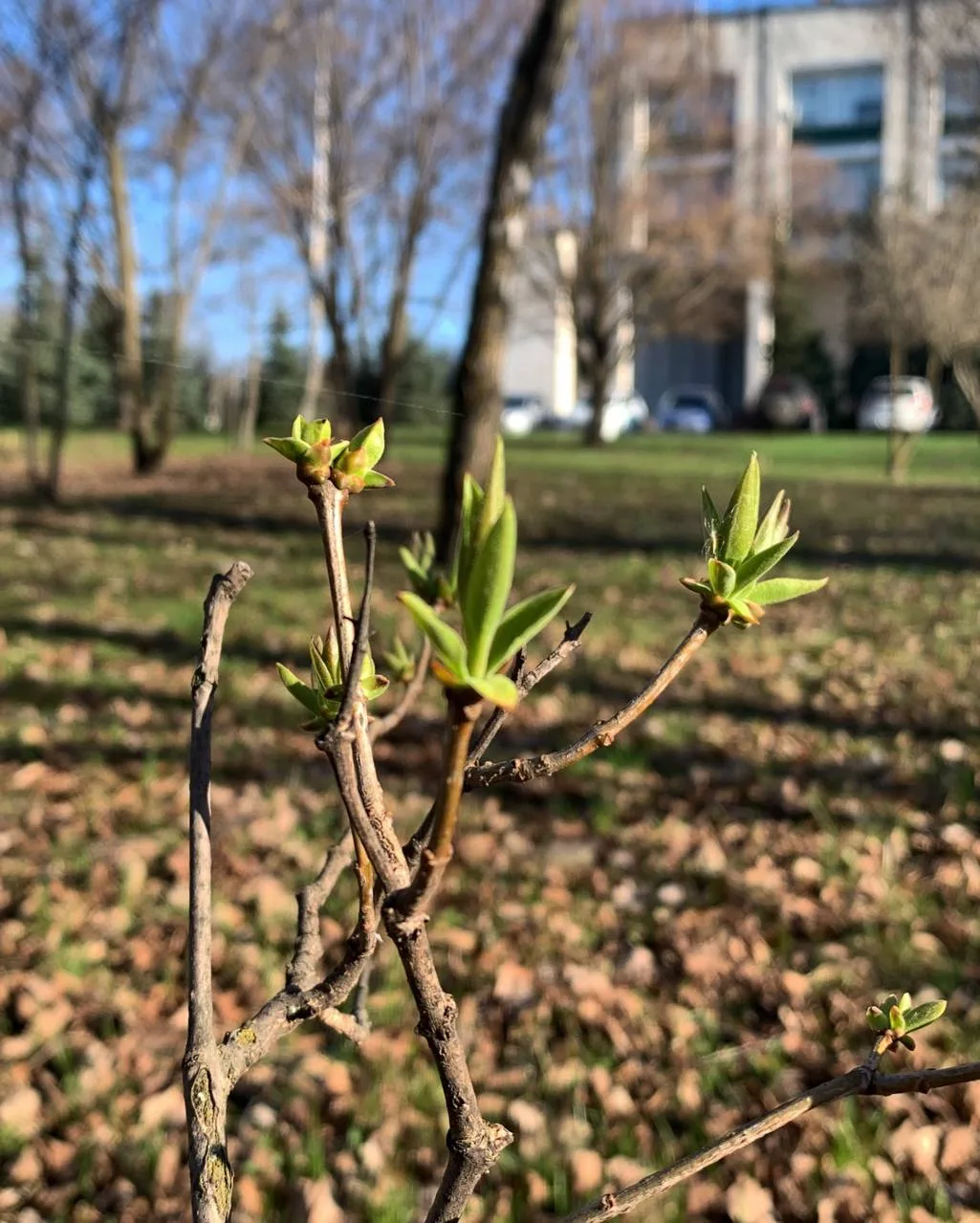 Вот они — наши свидетели весны: набухшие почки, первая робкая зелень и совсем юный тюльпан.
