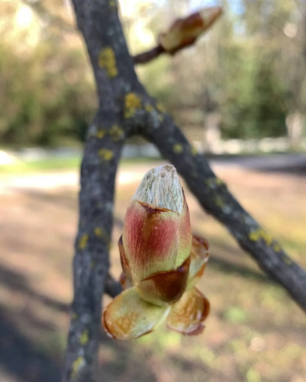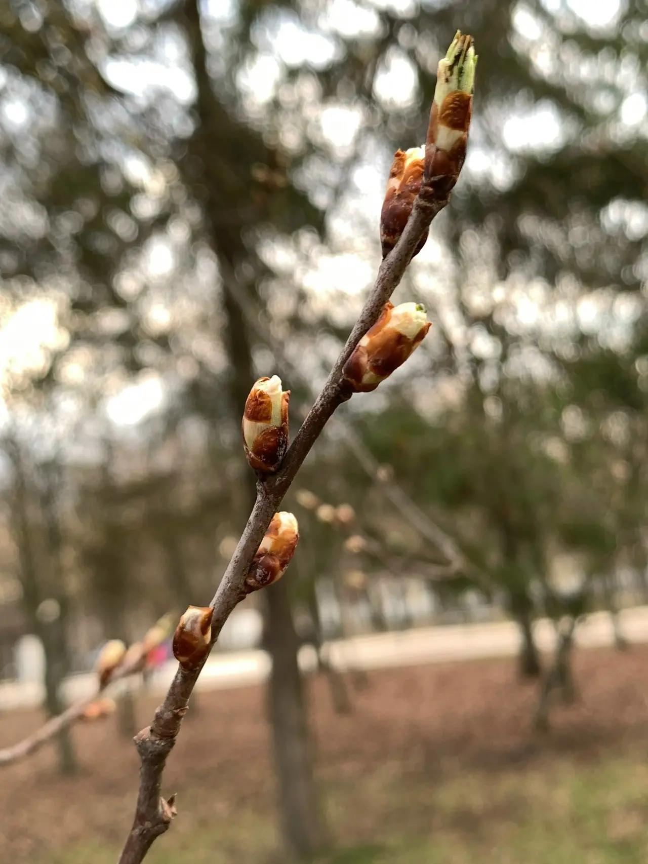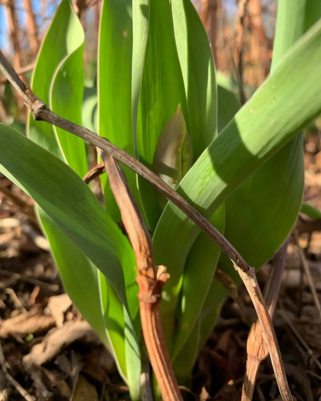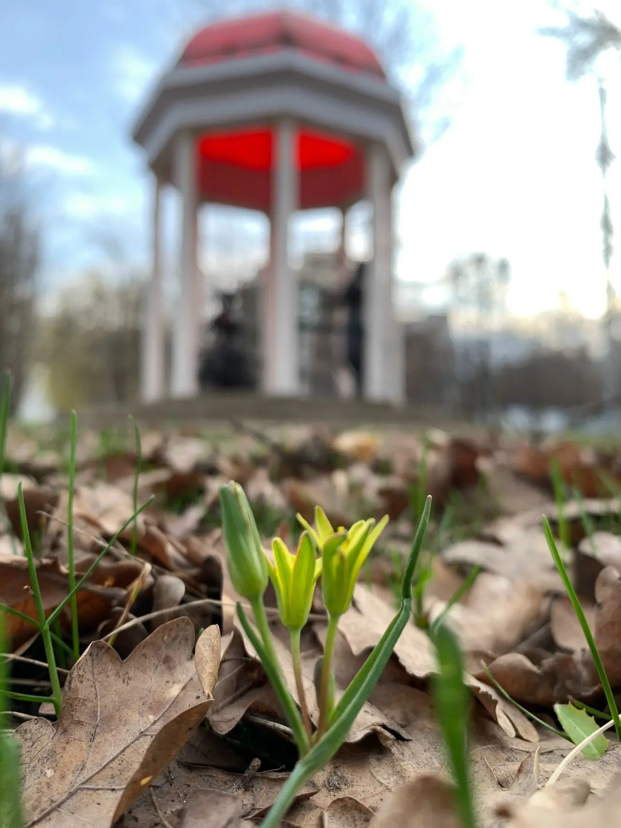 Вот они — наши свидетели весны: набухшие почки, первая робкая зелень и совсем юный тюльпан.