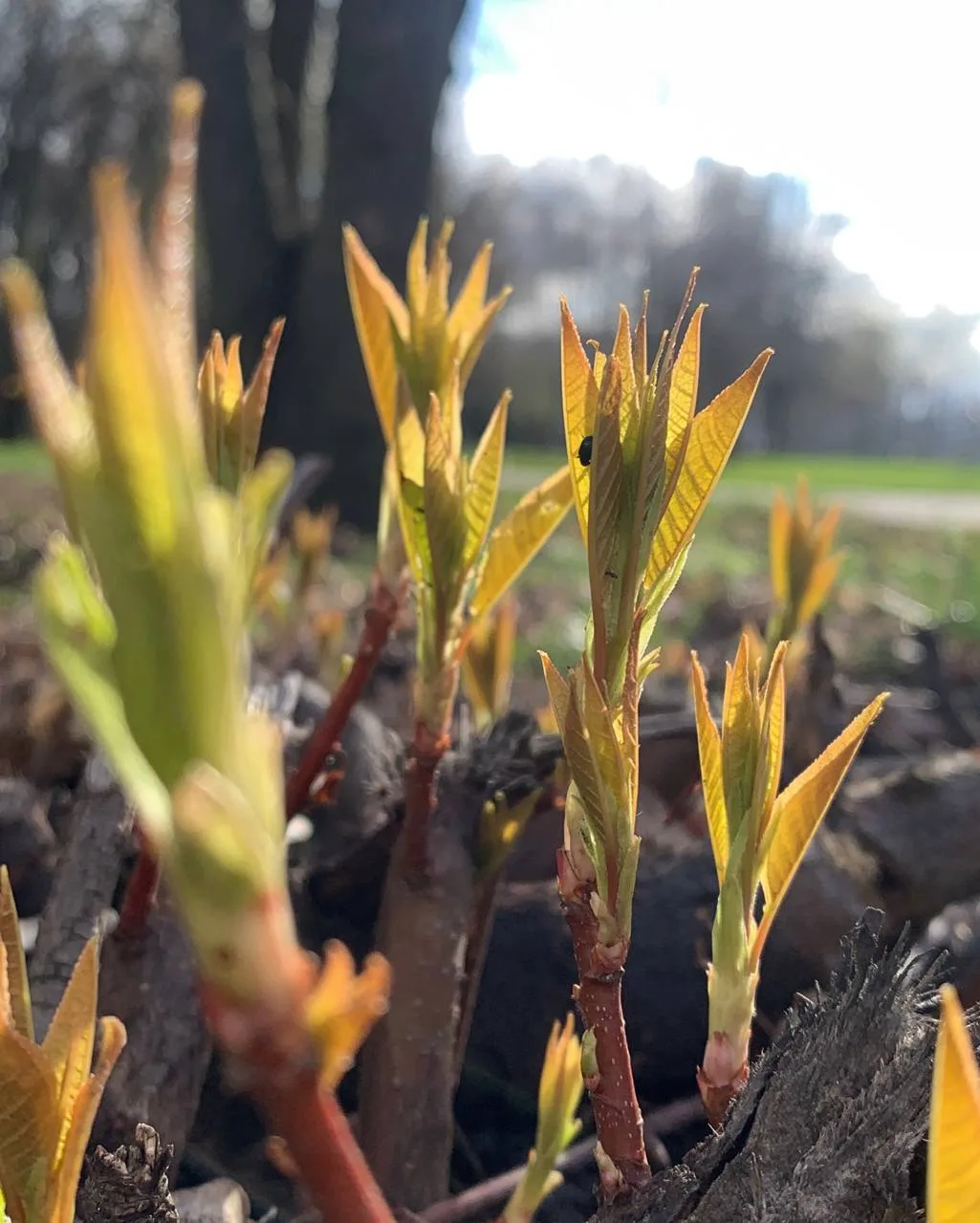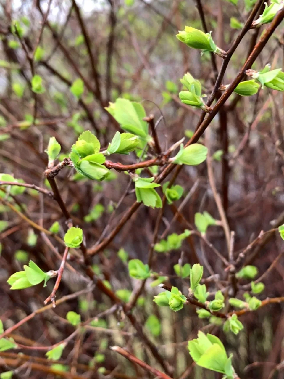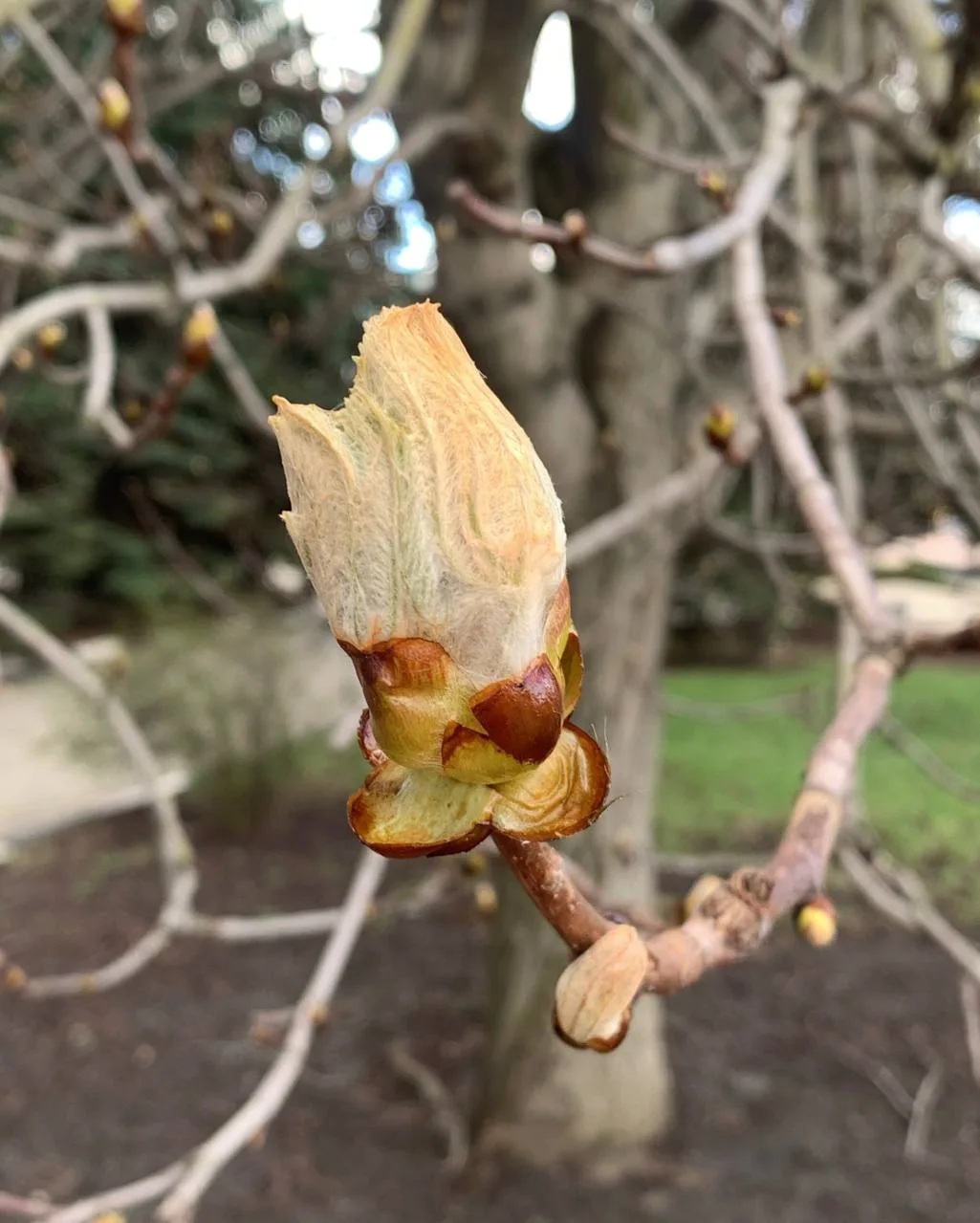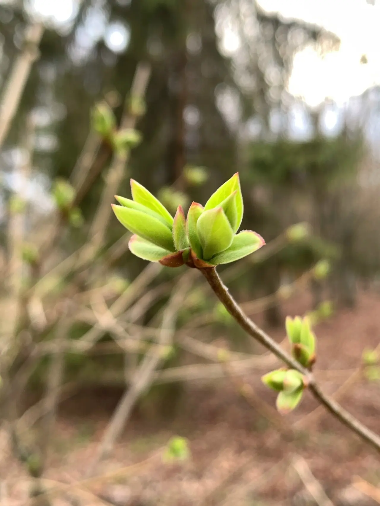 Вот они — наши свидетели весны: набухшие почки, первая робкая зелень и совсем юный тюльпан.