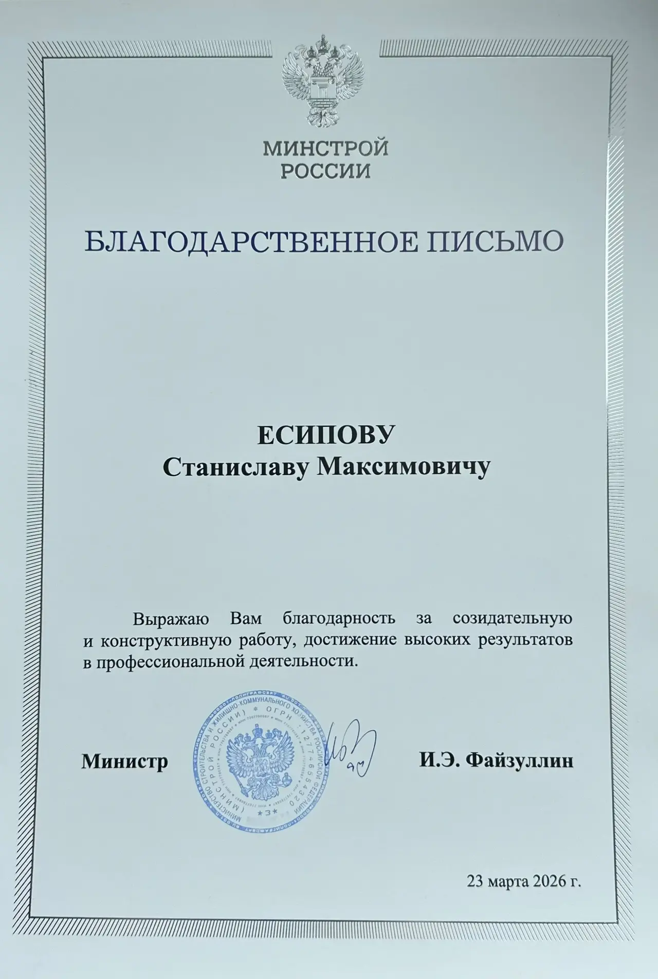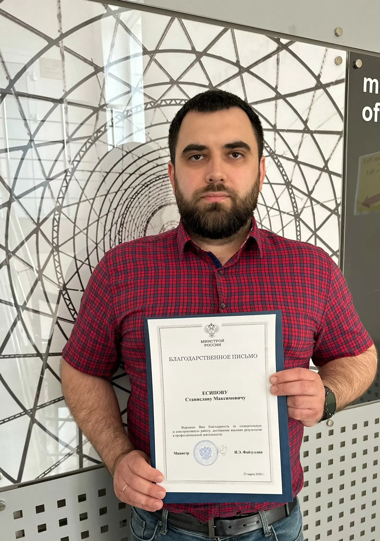 Заместитель заведующего кафедрой, кандидат технических наук, доцент Станислав Есипов отмечен благодарностью Министерства строительства и жилищно-коммунального хозяйства РФ. Ведомство оценило его созидательную, конструктивную работу и высокие результаты в профессиональной деятельности.