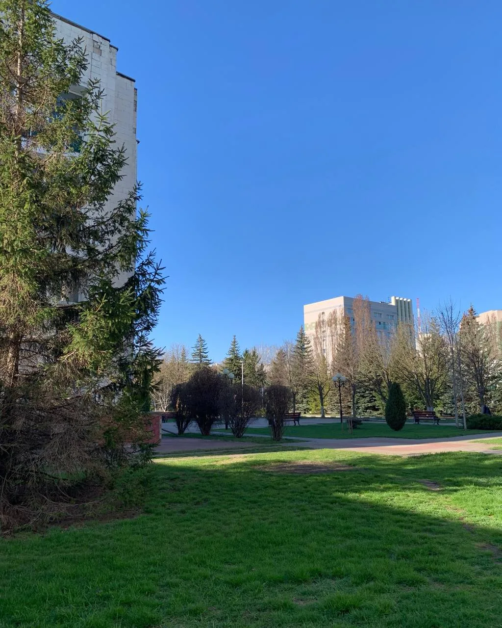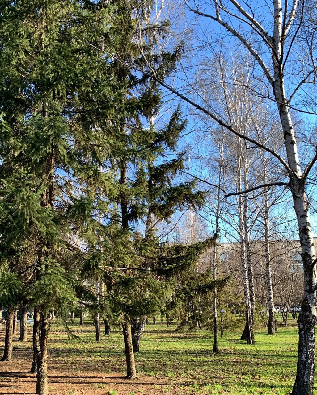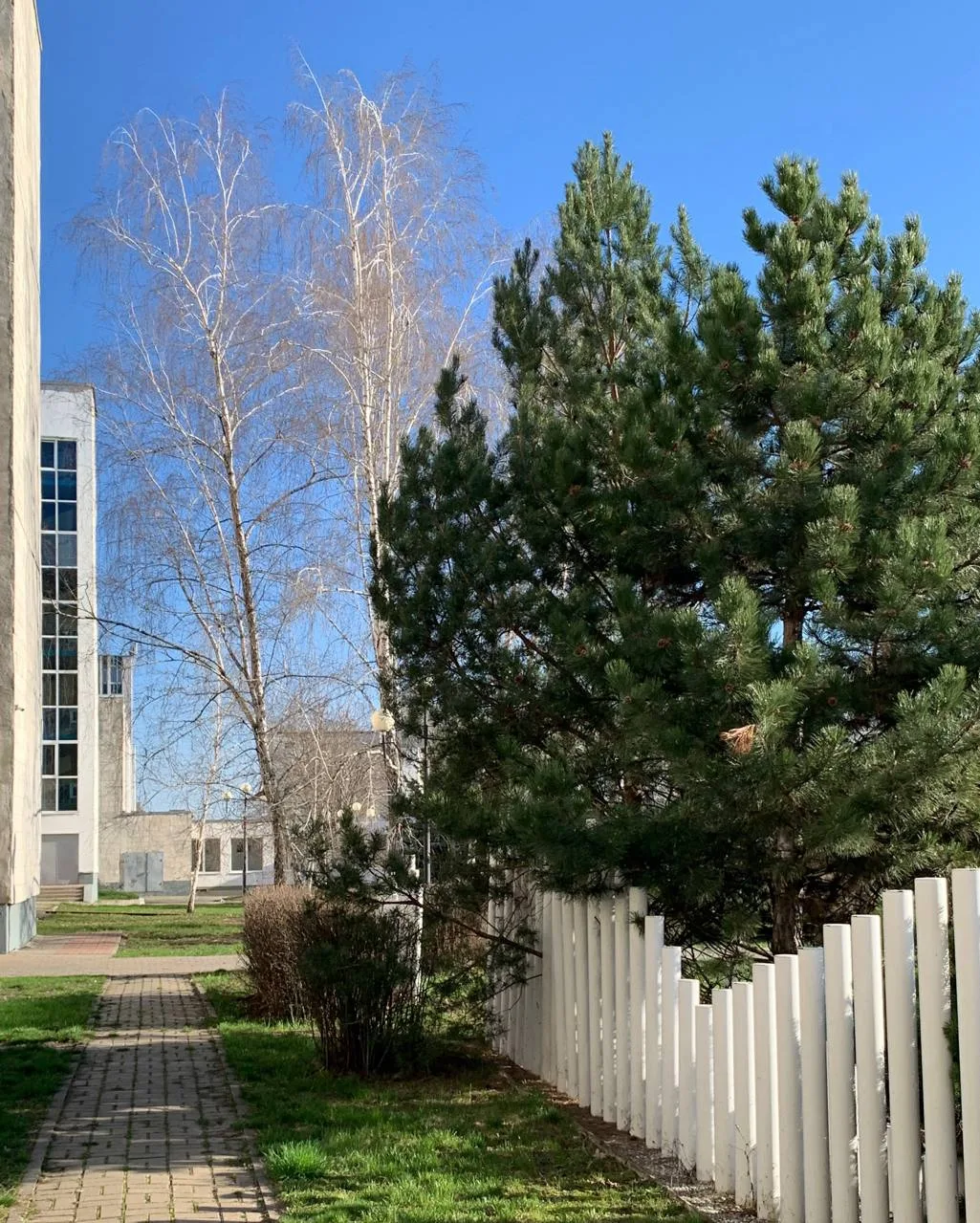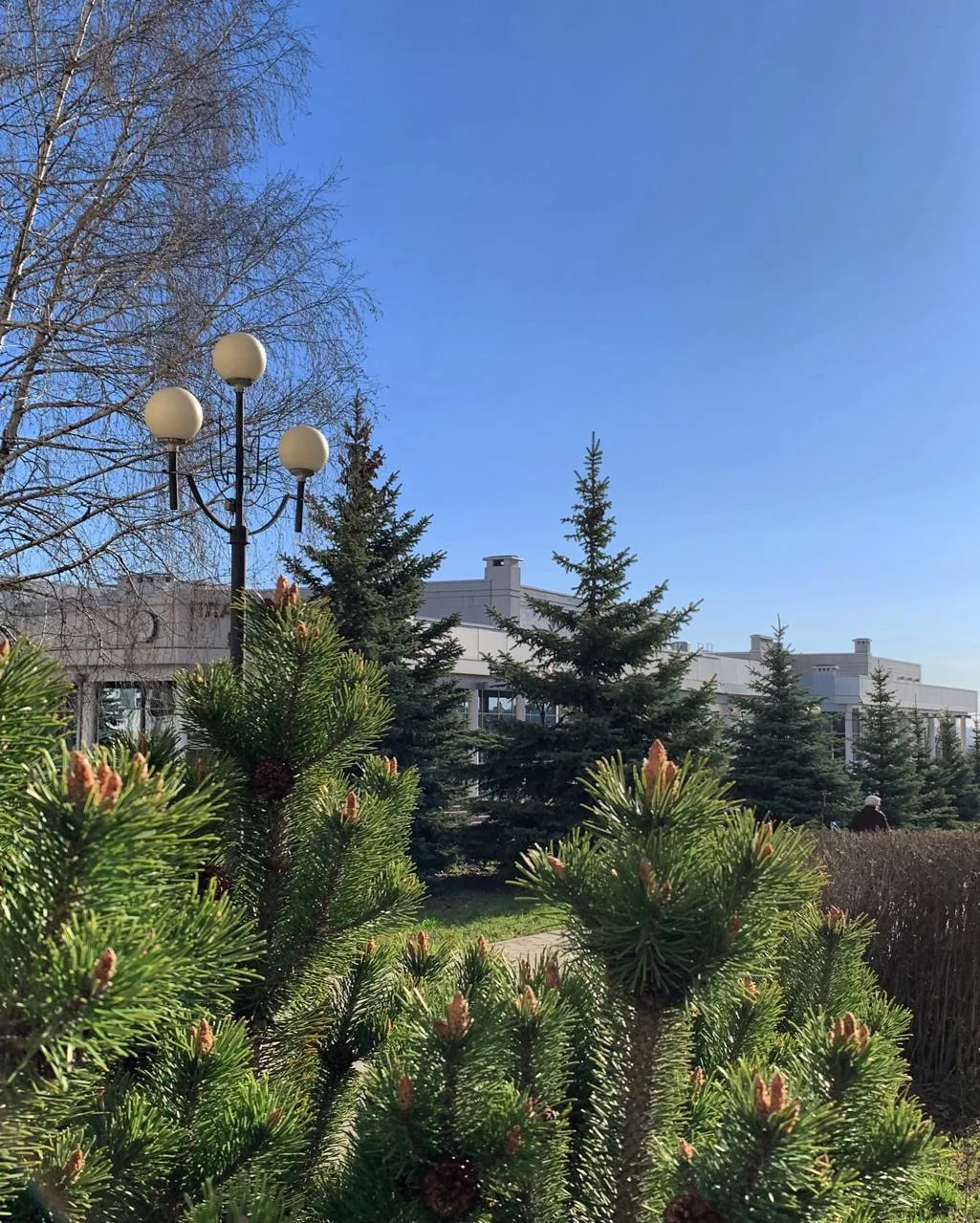 Кампус сегодня выглядит так, будто его специально нарисовали: солнце, невероятно красивое небо, набухшие почки, кое-где уже проклюнулись листочки, зеленая травка…