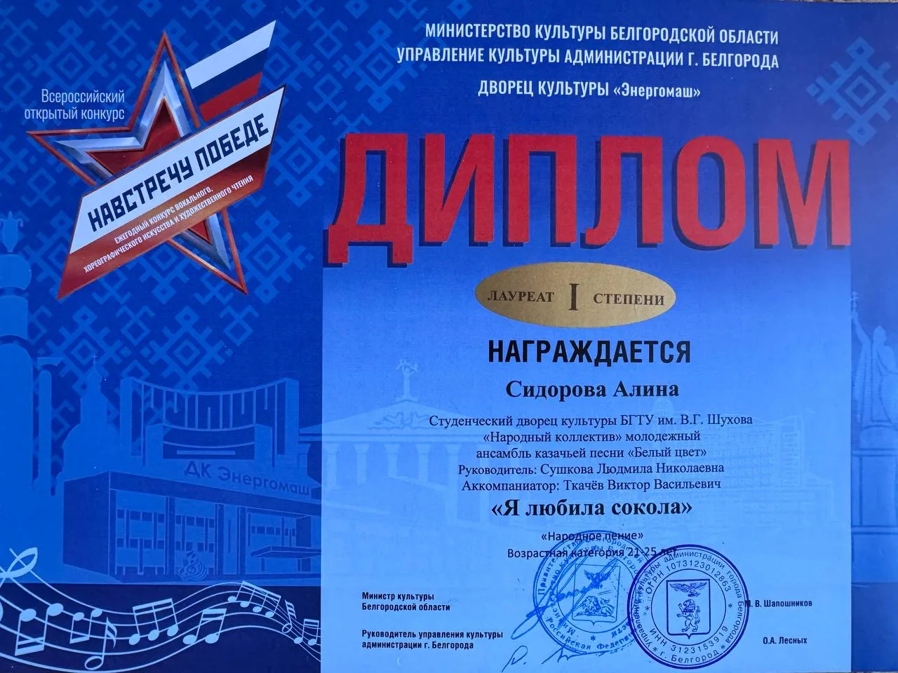 Алина Сидорова, студентка инженерно-строительного института БГТУ им. В.Г. Шухова и солистка молодежного ансамбля казачьей песни «Белый цвет» (руководитель Л. Сушкова), выступила на Всероссийском конкурсе вокального, хореографического искусства и художественного чтения «Навстречу Победе», который прошёл в ДК «Энергомаш».